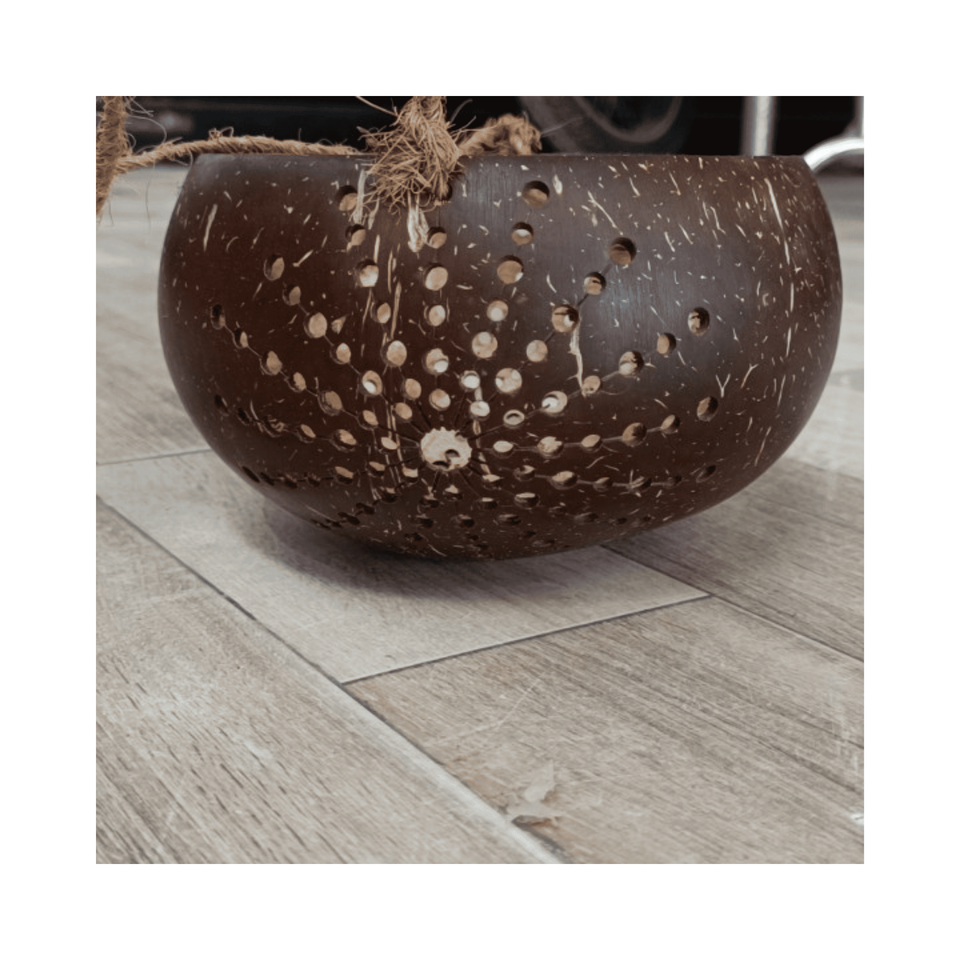 โคมไฟเปลือกมะพร้าว แสงจากเปลือกขัดเงา วัสดุ: มะพร้าวแกะสลัก ใช้สำหรับ: สร้างบรรยากาศบนโต๊ะ แหล่งกำเนิด: งานฝีมือจากเวียดนาม