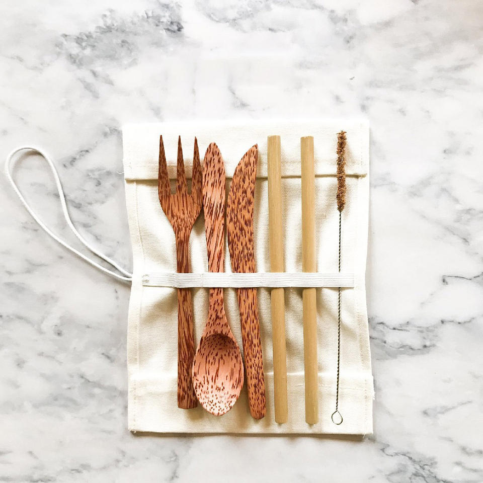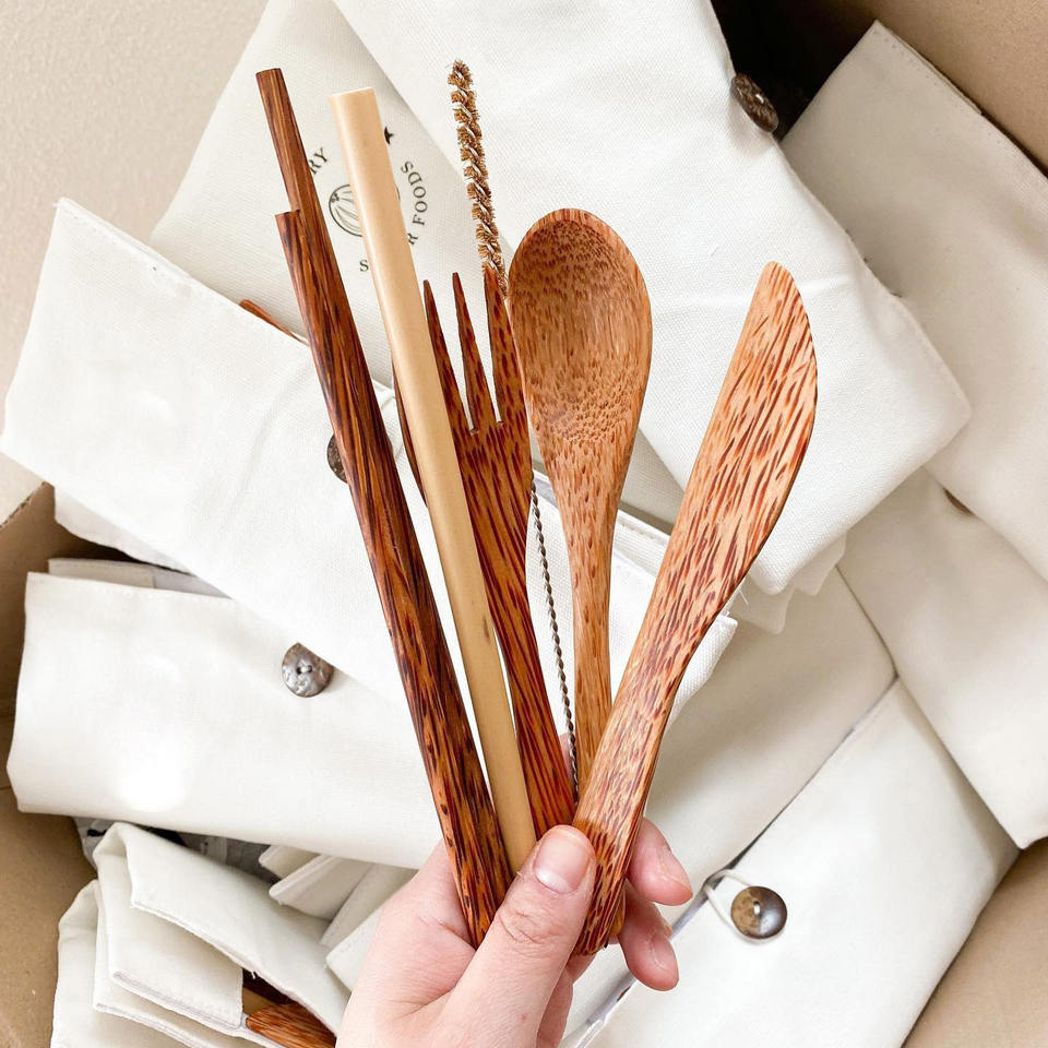 ชุดช้อนส้อมไม้มะพร้าวใช้ซ้ำได้พร้อมกระเป๋าเครื่องใช้บนโต๊ะอาหาร