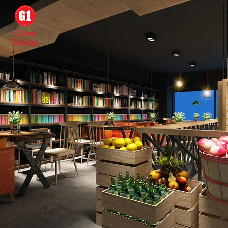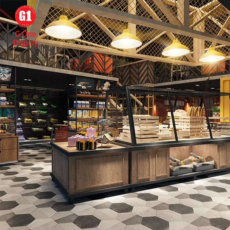 การออกแบบตกแต่งภายในร้านกาแฟและเบเกอรี่ เคาน์เตอร์โชว์อาหารแบบเร็วทำจากวัสดุแข็งแรง ตกแต่งด้วยไม้สำหรับวางขนมปัง