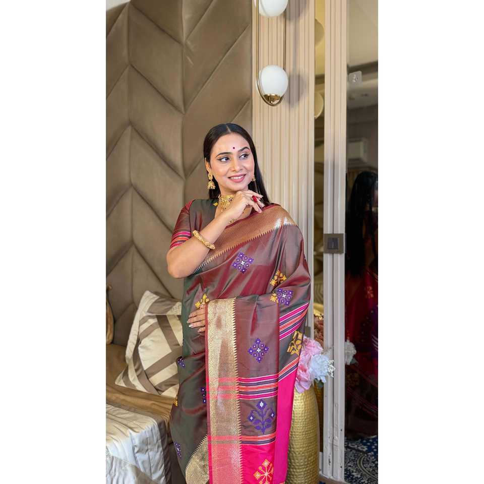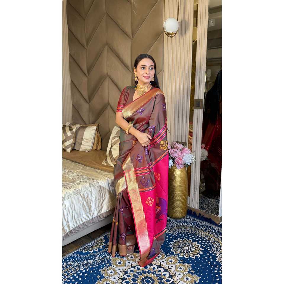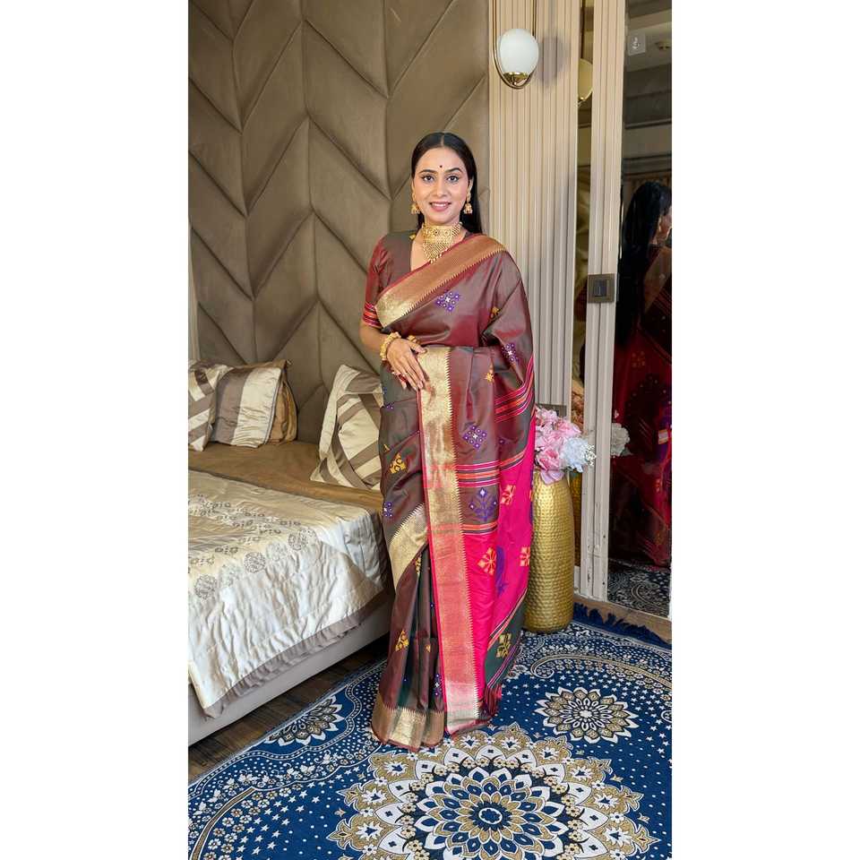 ชุดราตรีผ้าไหมอิกกะต์ปาโตลาสีน้ำตาลกาแฟ ลายลายนกยูง พร้อมขอบผ้าปักดิ้นทอง พร้อมผ้าคลุมไหล่ลายมีนาการี