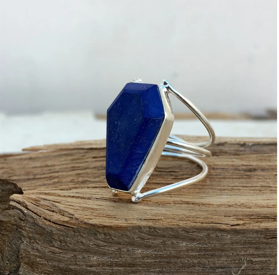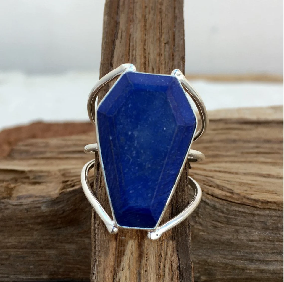 แหวนลาพิส ลาซูลีรูปโลงศพ พลอยสีน้ำเงินธรรมชาติ แหวนเงินแท้ทำมือ เครื่องประดับสไตล์โบโฮ ของขวัญสำหรับเธอ/เขา