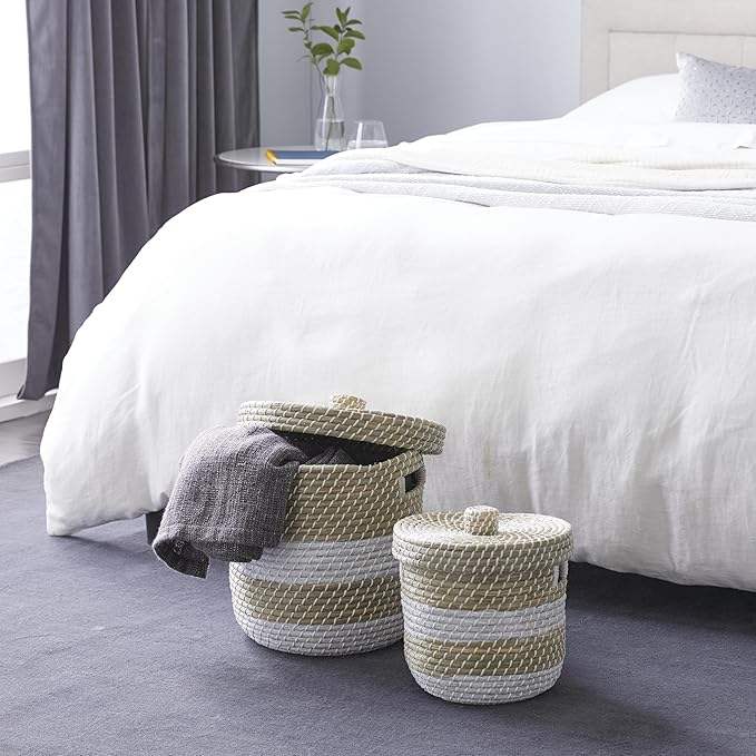 ตะกร้าหวายหญ้าทะเลแบบม้วนอเนกประสงค์เป็นมิตรกับสิ่งแวดล้อมตะกร้าไม้ไผ่สีสันสดใสสำหรับห้องครัวบ้านหรืออาหารสำหรับตกแต่งซักรีด