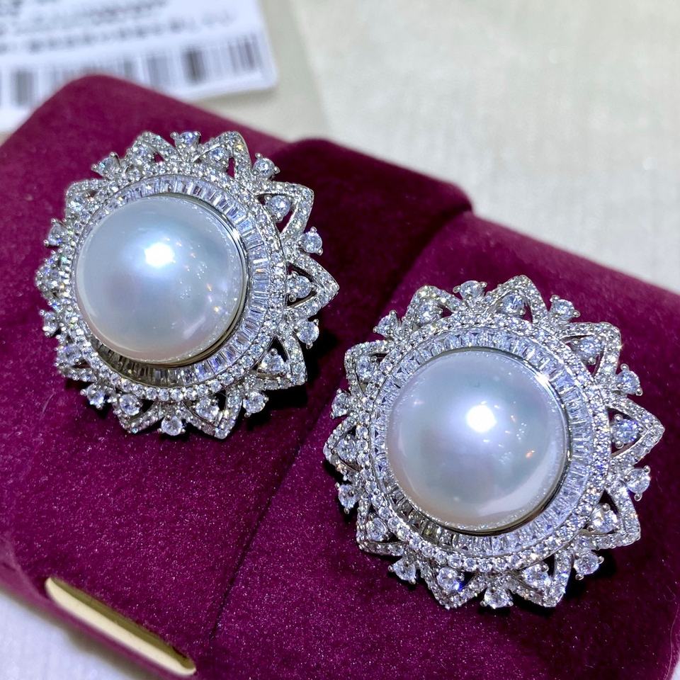 ต่างหูมุกอะโกย่าน้ำจืดทรงกลม 9-10 มม. สีขาวเย็น 18K ไร้ตำหนิ พร้อมกล่องของขวัญ