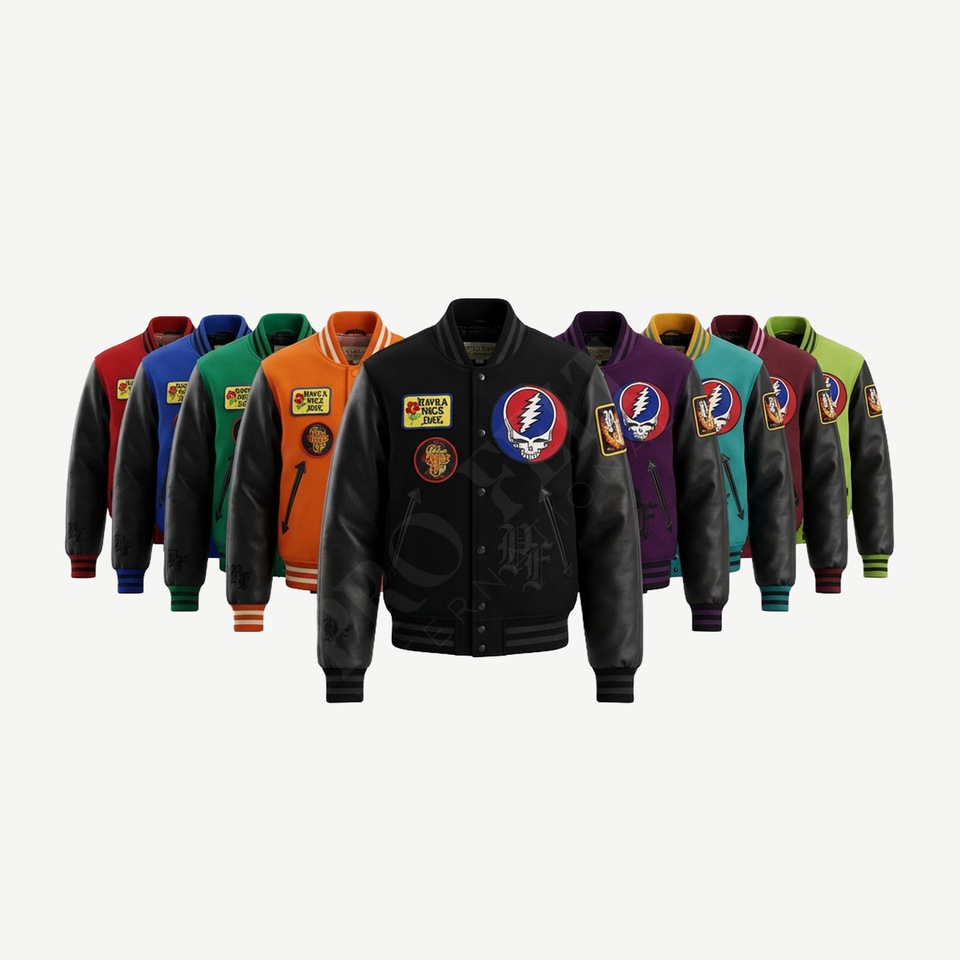 เสื้อแจ็คเก็ตเบสบอลแบบวาร์ซิตี้สำหรับผู้ชาย สวมใส่สบาย ขายดี รับสั่งทำได้ 男女 ใส่ได้ กันน้ำ กันลม ตกแต่งด้วยลายปะติดรูปหัวกะโหลก