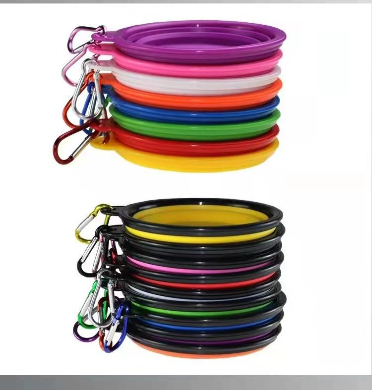 ชามใส่น้ำและอาหารสุนัขแบบพับได้อุปกรณ์เลี้ยงพลาสติกแบบพกพาพร้อมห่วงเกี่ยวนิรภัยสำหรับการเดินทางกลางแจ้งสำหรับแมว