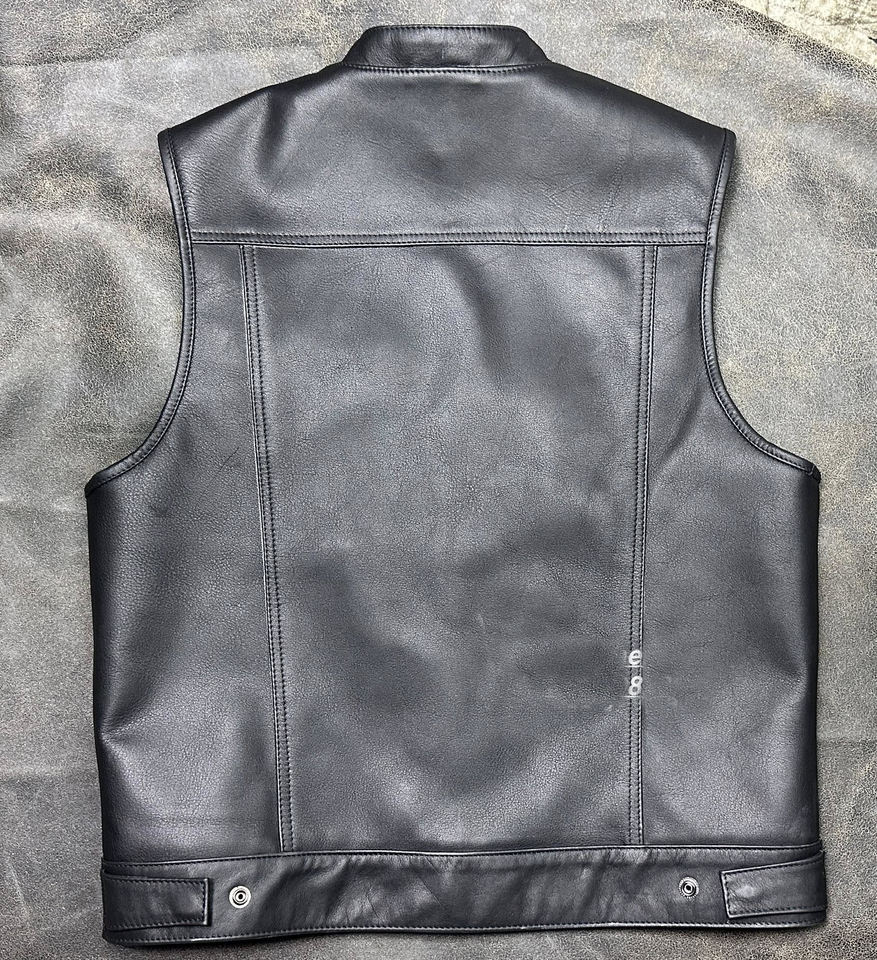 เสื้อกั๊กหนังสไตล์ไบค์เกอร์แบบไม่มีปก สีดำ
