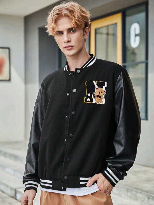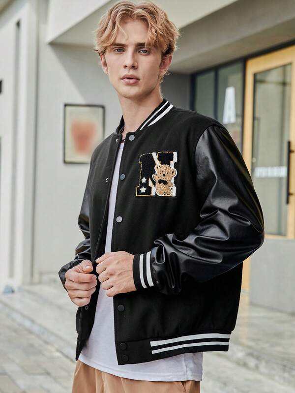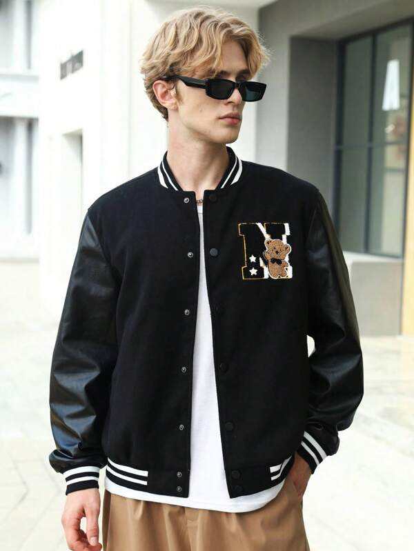 แจ็กเก็ตเบสบอลบอมเบอร์ทีมมหาวิทยาลัยขนแกะแขนเสื้อหนัง PU สำหรับผู้ชายเสื้อตัวนอกสำหรับฤดูหนาวดีไซน์ตัวอักษรแนวสตรีท