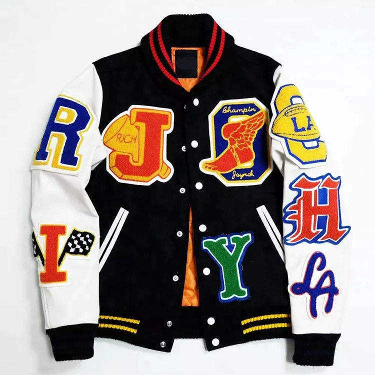 แจ็คเก็ตสไตล์วิทยาลัย แขนหนัง ตัวเสื้อผสมขนสัตว์ ชายเสื้อแบบริบ กระดุมแป๊ก สตรีทแวร์ ลำลอง เสื้อนอก โรงงานรับผลิตแบบ OEM ODM