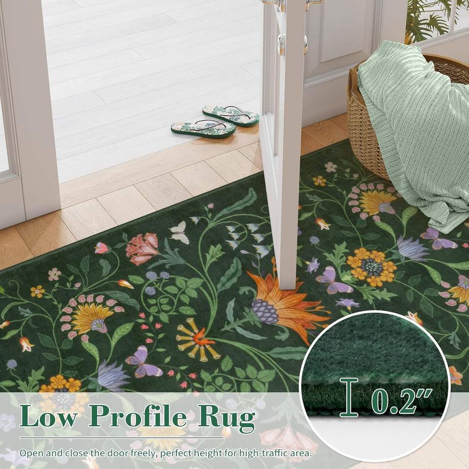 พรมปูพื้นทางเข้าต่ำลายดอกไม้สไตล์โบฮีเมียนพรมปูทางเดินกันลื่นสีเขียวสำหรับห้องนอนขนาด2x6