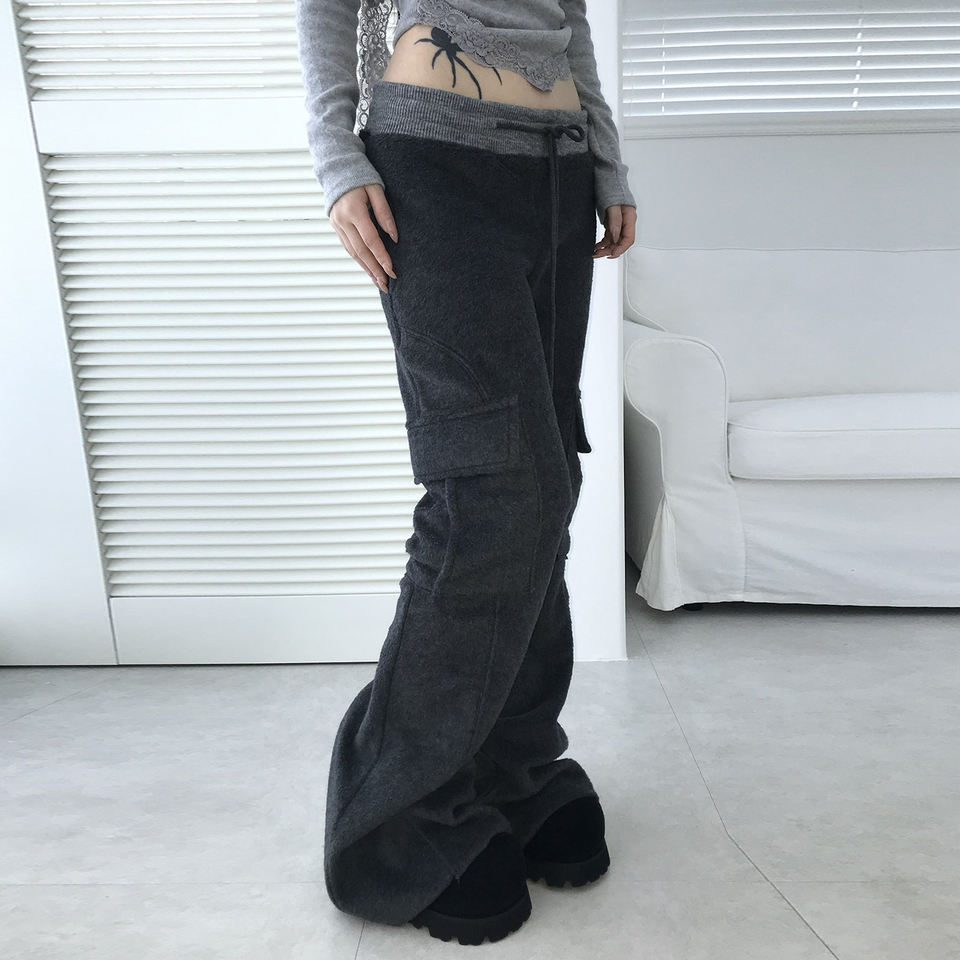 กางเกงขายาวทรงตรงผ้าถักแบบมีเชือกผูกเอว สีสันตัดกัน สไตล์ลำลอง สปอร์ต ใส่สบายๆ อยู่บ้าน ใช้งานได้หลากหลาย