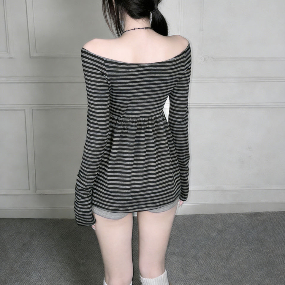 เสื้อยืดแขนยาวคอวีลายบล็อกสีตัดต่อผ้าลายทางผูกโบว์ สไตล์ Y2K ลำลองทรงเอสำหรับผู้หญิง