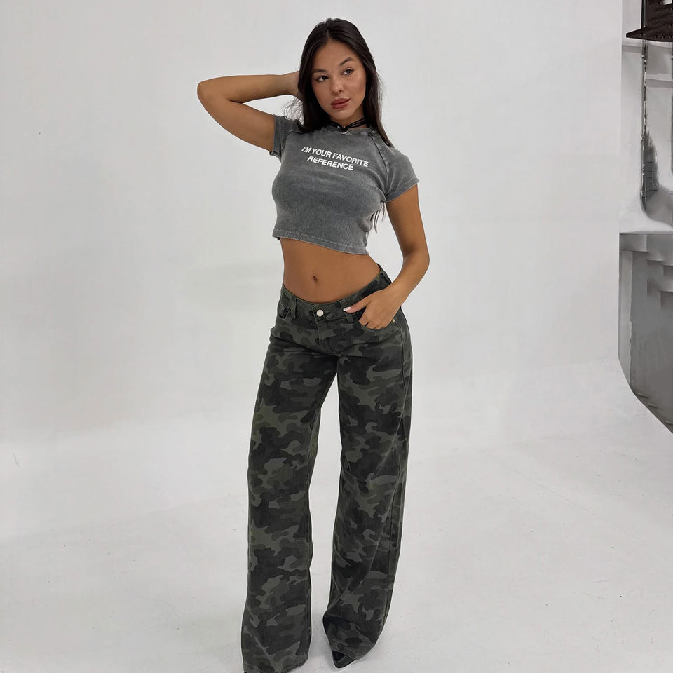 กางเกงยีนส์ทรงตรงหลวมเอวกลาง ล้างสีกลาง ผ้าทอแบบกันลม เป็นมิตรกับสิ่งแวดล้อม แต่งขอบตัดสี ดีไซน์ลำลอง