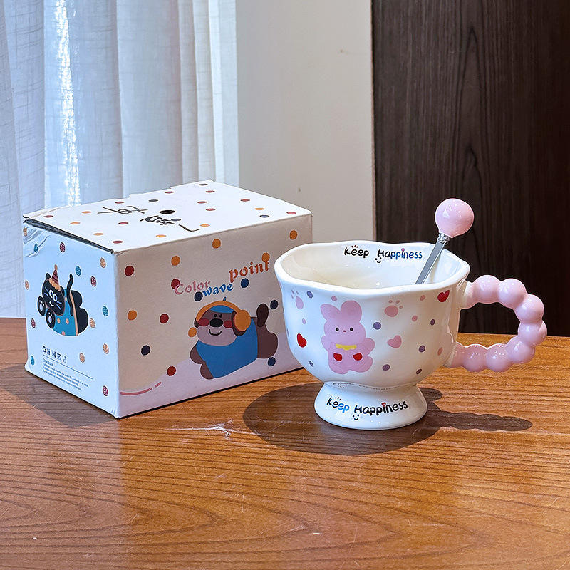 แก้วเซรามิคสีสันสดใสพร้อมช้อนลายการ์ตูน ดีไซน์เก็บความสุข สำหรับสาวๆ ของขวัญ ฤดูใบไม้ผลิ 2025
