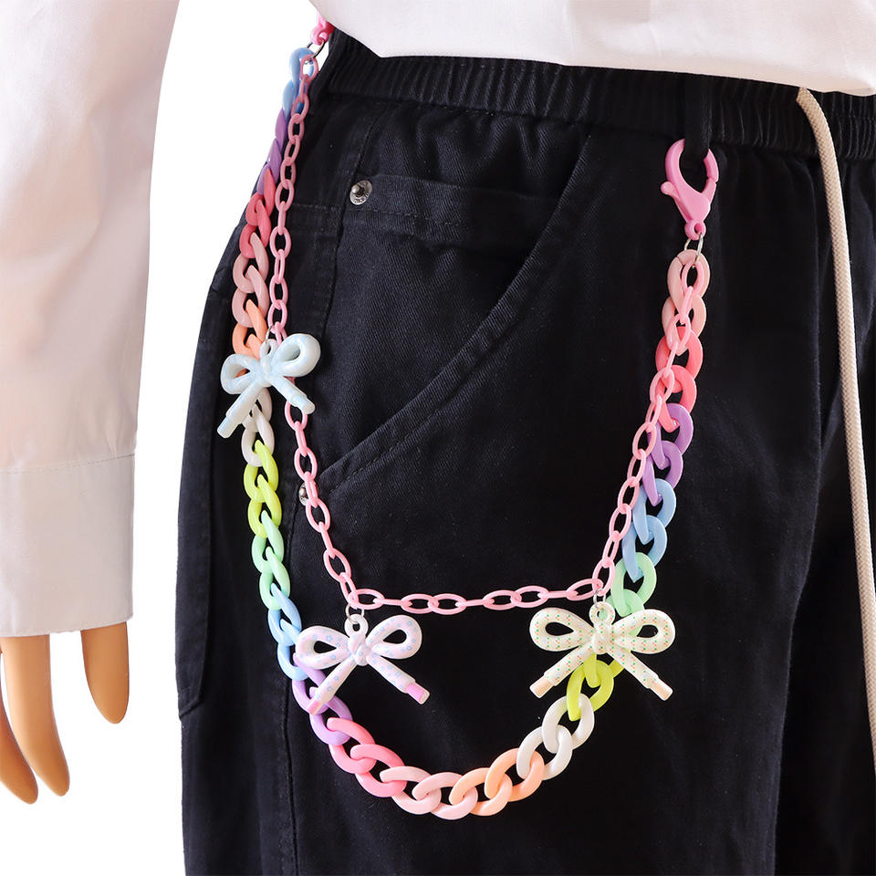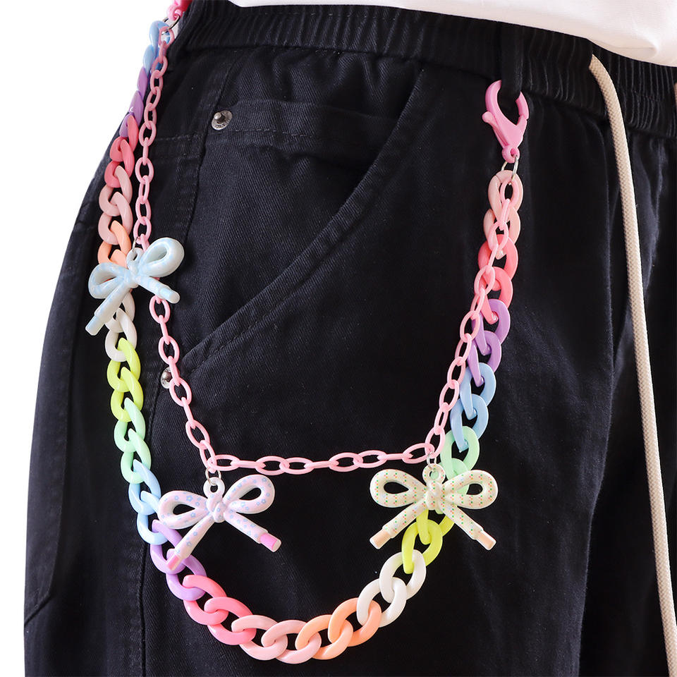 โซ่คาดเอวอะคริลิคสีสันสดใสสำหรับผู้หญิง สไตล์พังก์ แฟชั่นสำหรับออกงานกลางคืน ดีไซน์โบว์สีชมพูหลายห่วง