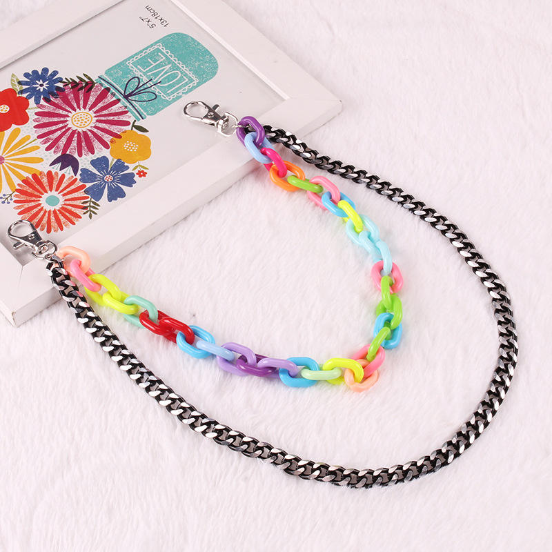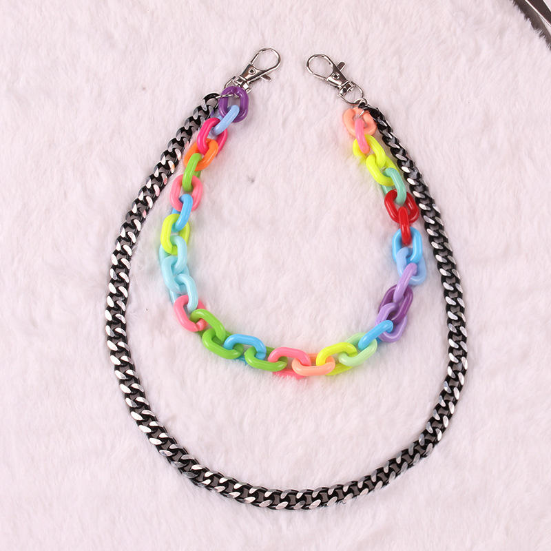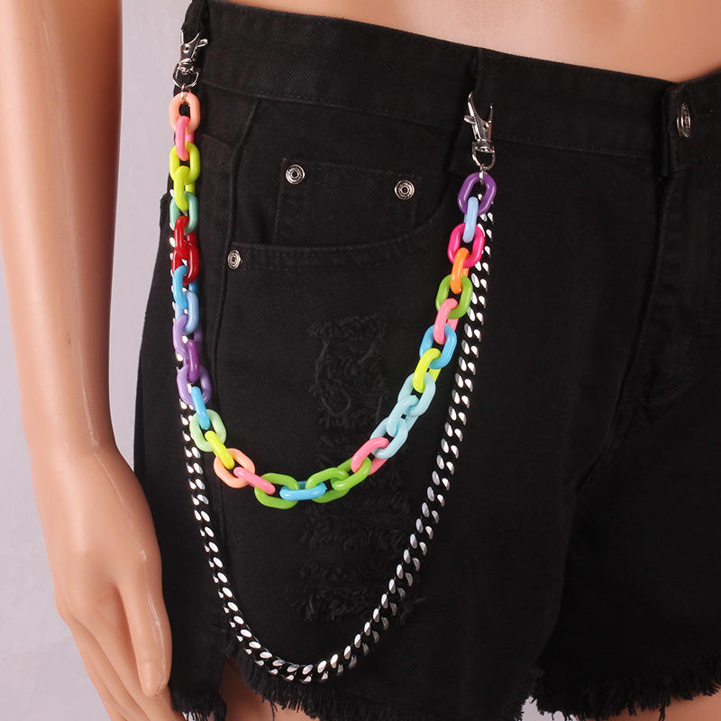 โซ่คาดเอวอะคริลิคสีสันสดใส โลหะสีกันเมทัล สไตล์ฮิปฮอป ตกแต่งด้วยโซ่สองชั้นสำหรับกางเกง ใช้ได้ทั้งชายและหญิง สวมใส่ได้ทุกวัน ผลิตจากโลหะผสมสังกะสี