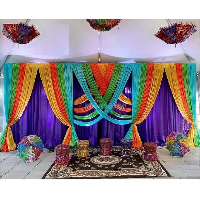 ฉากหลังสีสันสดใสสำหรับงานเลี้ยง Sangeet Night Stage ผ้าม่านสีสันสดใสที่น่าตื่นตาตื่นใจสำหรับตกแต่งกลางคืน Mehndi ชุดผ้าม่านสีสันสดใส