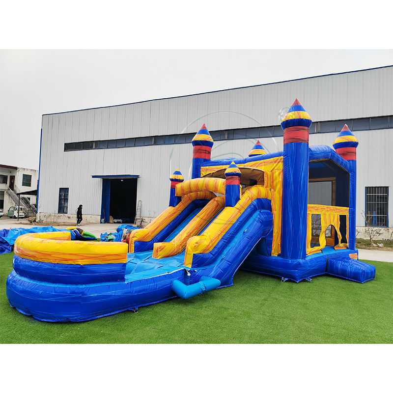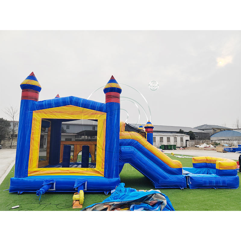 บ้านลมเป่าลมสีฟ้าลายหินอ่อนหลากสีพร้อมสไลเดอร์และสระน้ำ บ้านลมเป่าลมเชิงพาณิชย์แบบคอมโบพร้อมสไลเดอร์