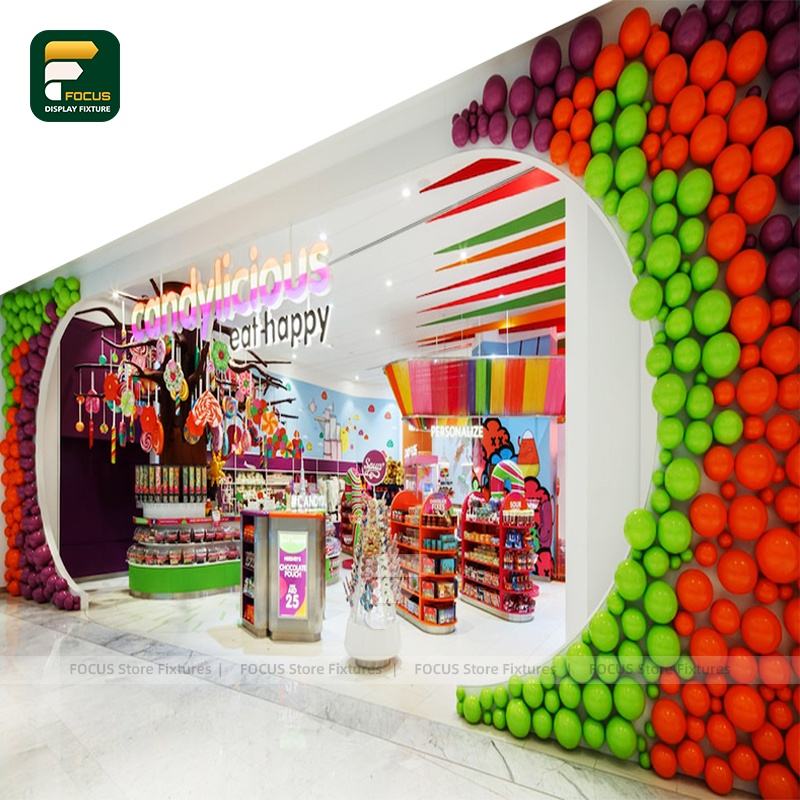 ชั้นวางสินค้าร้านขายขนมหลากสีสัน ชั้นวางกอนโดลาสำหรับร้านค้าปลีก ชั้นวางทรงกลมแบบกำหนดเอง เฟอร์นิเจอร์ตกแต่งภายในร้านขนม