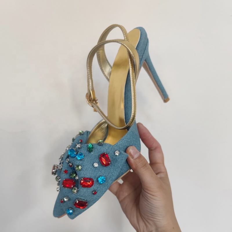 รองเท้าส้นสูงสีน้ำเงินประดับเพชรหลากสีสำหรับผู้หญิง แบบส้นเข็ม ปลายแหลม สายรัดข้อเท้า ทำจากผ้ายีนส์
