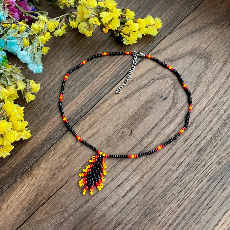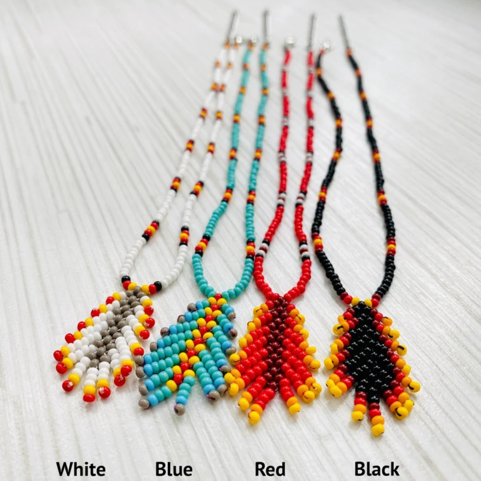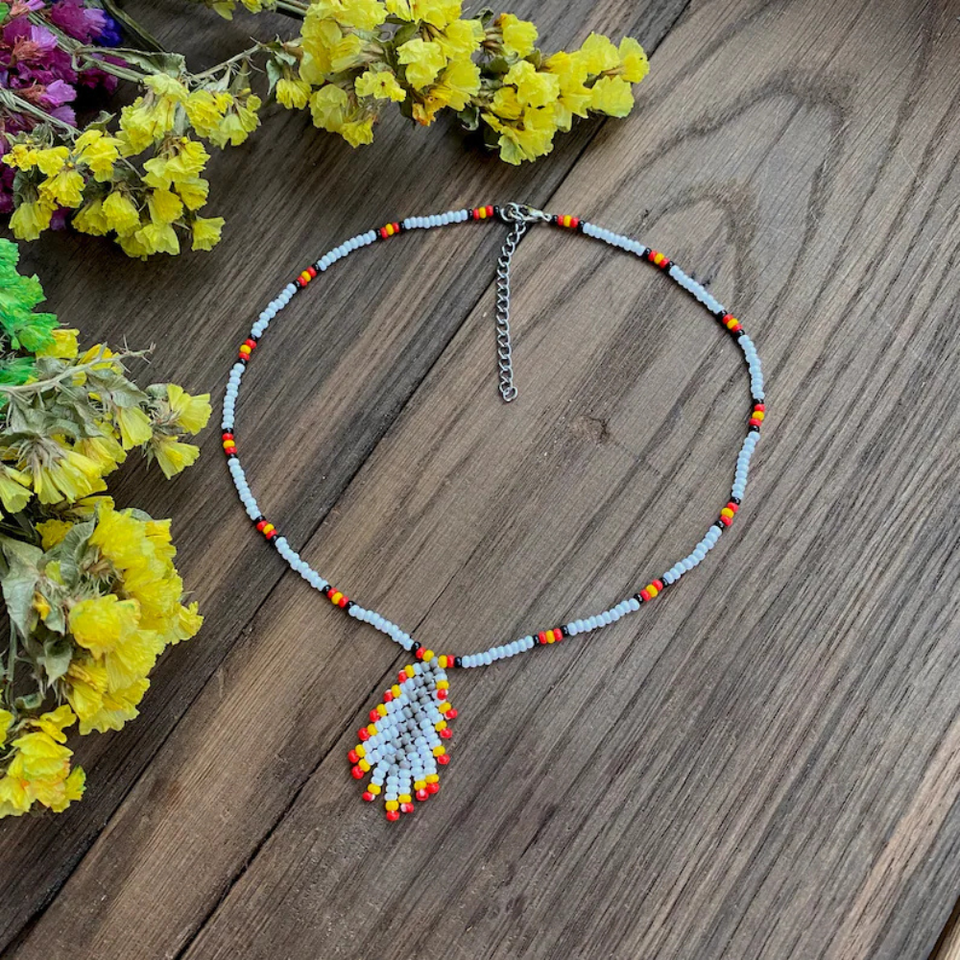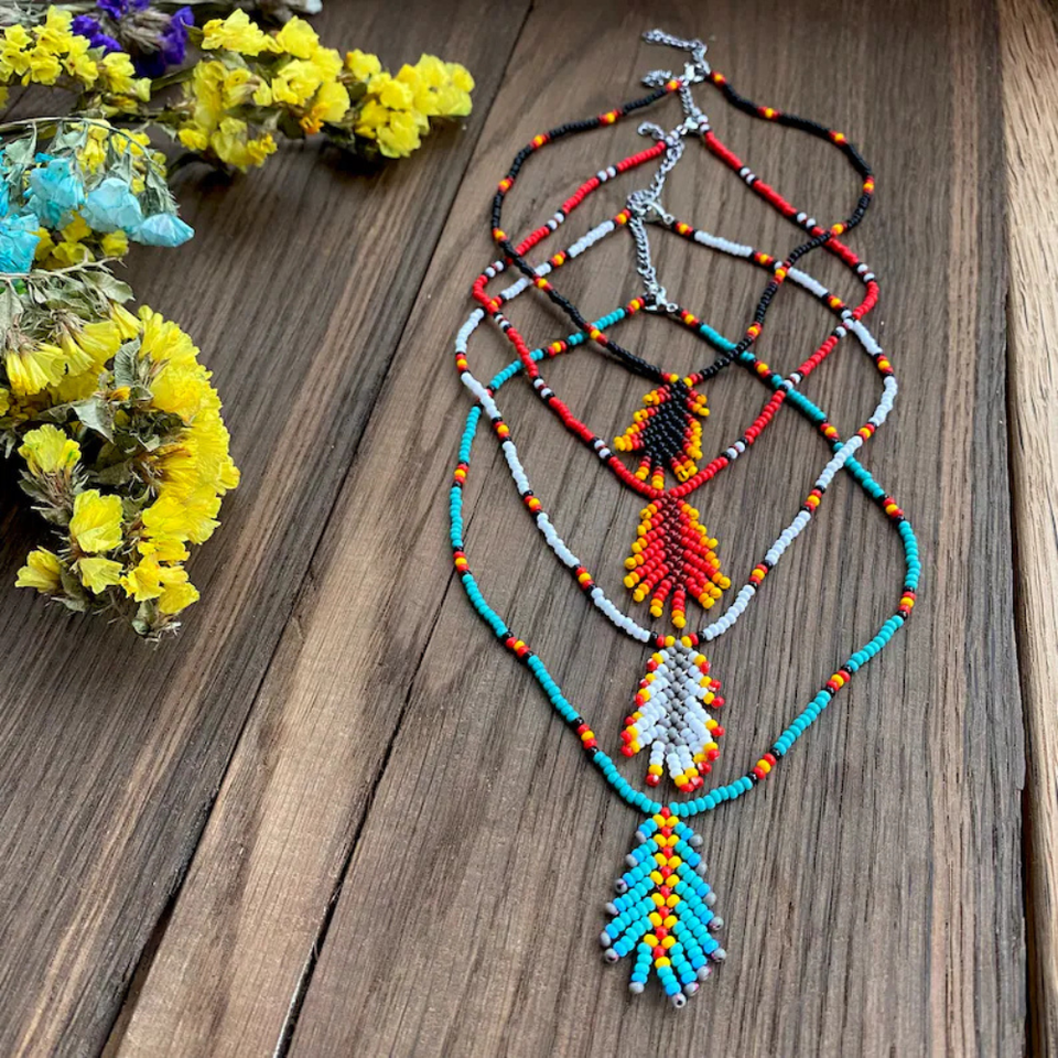 สร้อยคอแบบโชคเกอร์ประดับขนนกหลากสีสัน สร้อยคอลูกปัดเมล็ดพันธุ์แบบพื้นเมือง แรงบันดาลใจจากวัฒนธรรมชนพื้นเมือง สไตล์โบฮีเมียน ฮิปปี้ และเอกลักษณ์แบบชาติพันธุ์