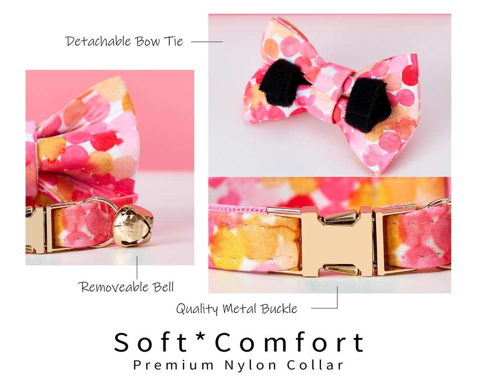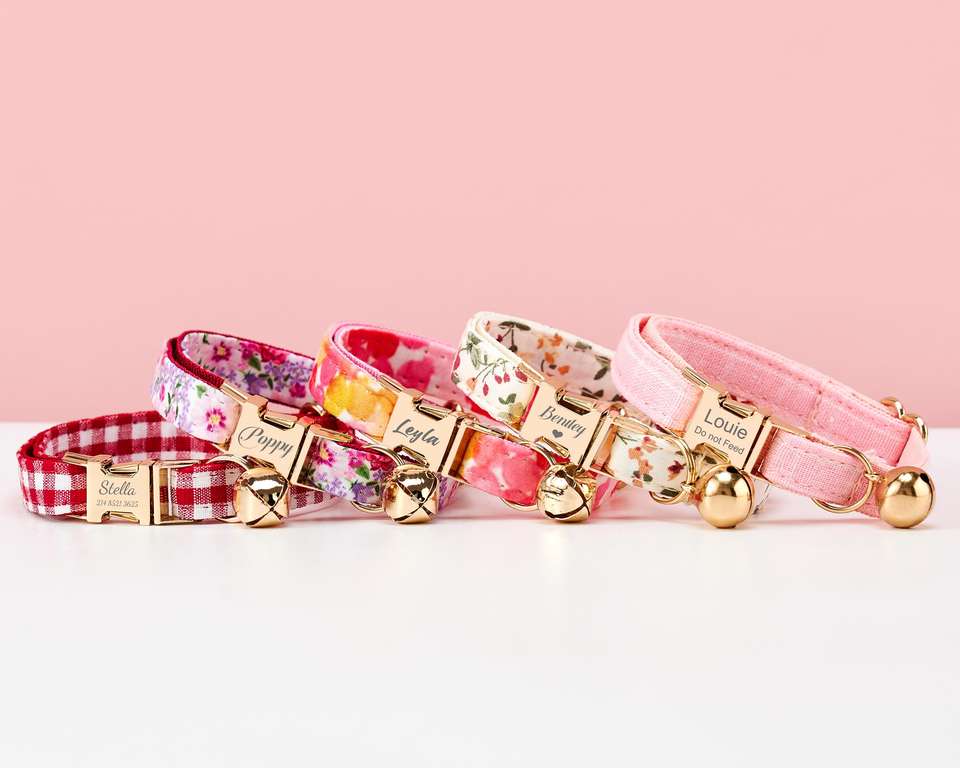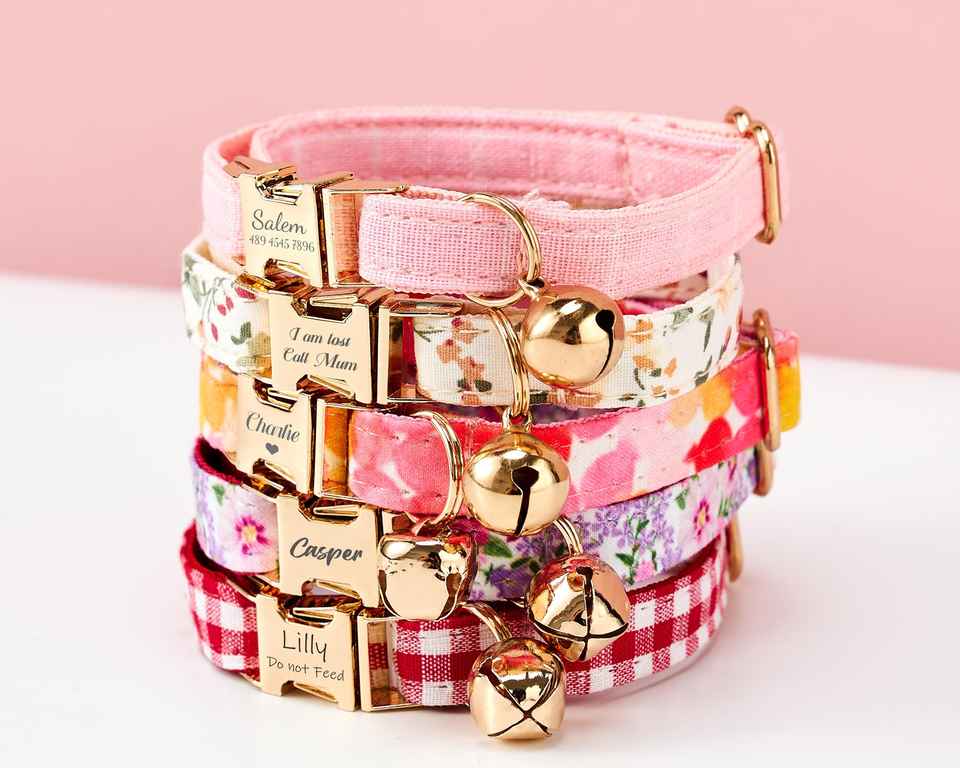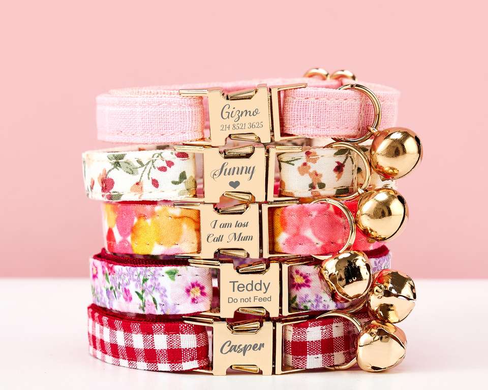 ชุดสายจูงผูกโบว์ผูกคอแมวลายดอกไม้สีสันสดใสสลักชื่อลูกแมวลูกสุนัขแบบกำหนดเองฟรีกระดิ่งสีทองขนาดเล็ก
