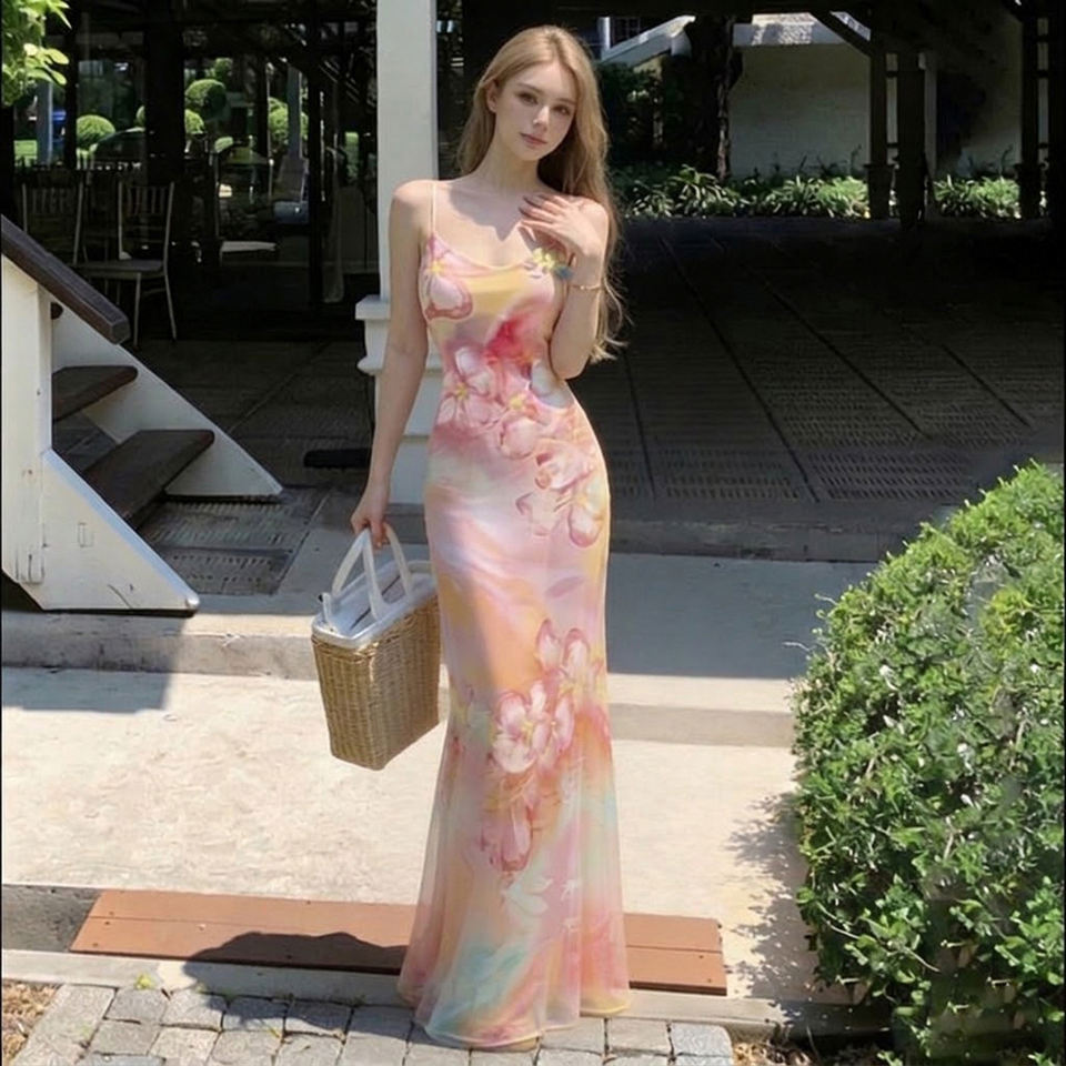 เดรสยาวทรงเมอร์เมดพิมพ์ลายดอกไม้สีสันสดใส สายเดี่ยว ดีไซน์เซ็กซี่เข้ารูป สไตล์วันพักผ่อน