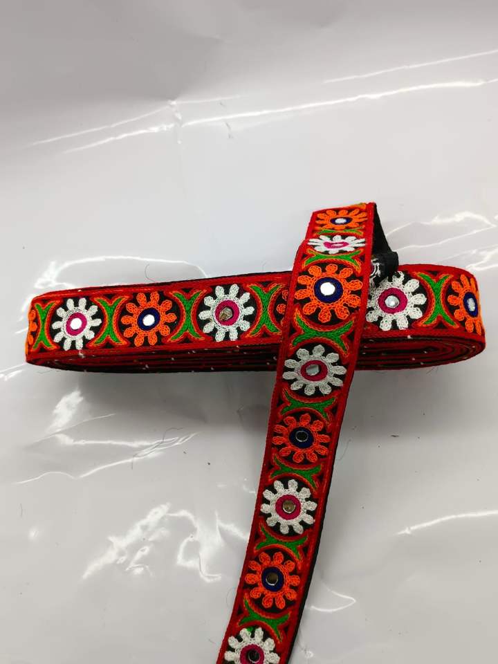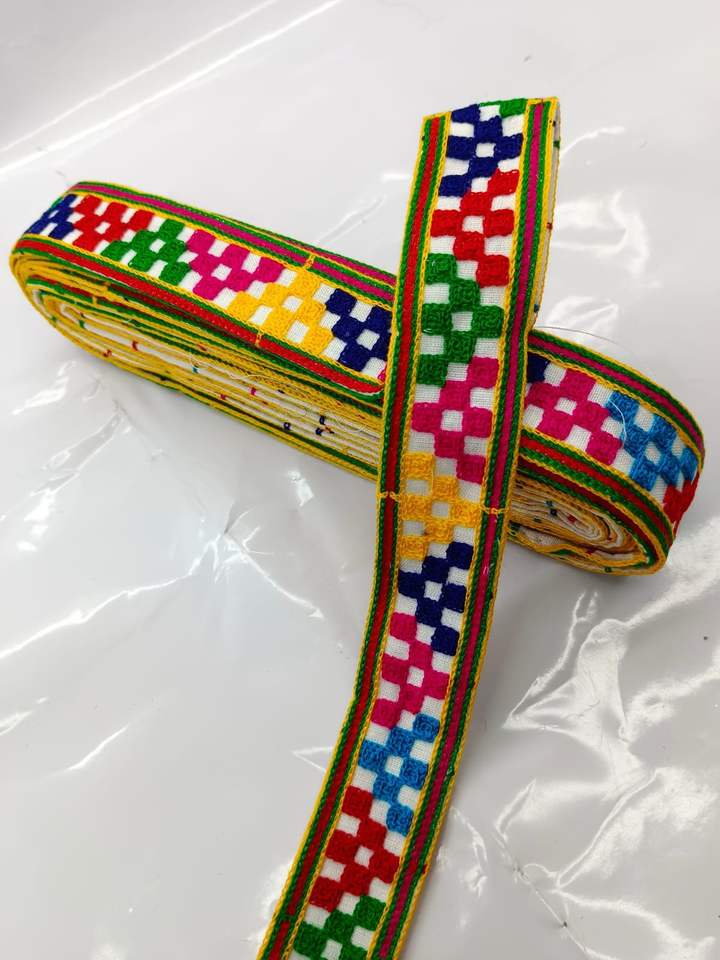 ผ้าลูกไม้กัมธีสีสันสดใสพร้อมลวดลายปักประณีต ใช้กันอย่างแพร่หลายสำหรับขอบผ้าส่าหรีและชุดงานเทศกาล