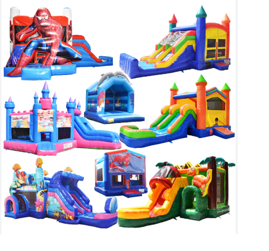 บ้านกระโดดเด้งกลางแจ้งสำหรับเด็กสีสันสดใสบ้านกระโดดเด้งพร้อมสไลด์คอมโบโรงงานขายส่ง