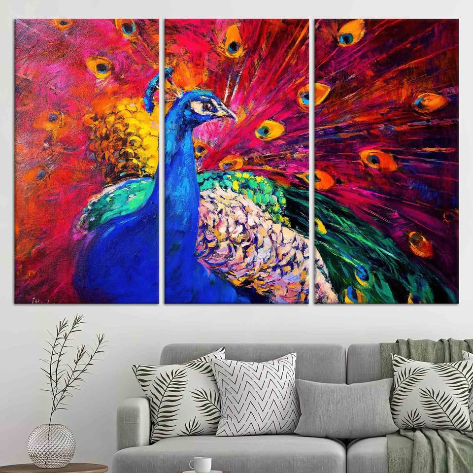 ศิลปะบนผืนผ้าใบลายนกยูงหลากสี: ของตกแต่งผนังพิมพ์ลายขนาดใหญ่ ชุดผ้าใบ 3 ชิ้น