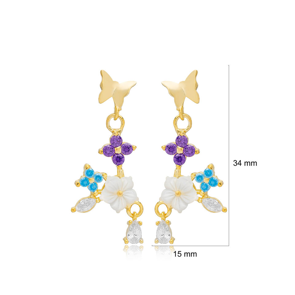 ที่มีสีสันรุ้งฤดูร้อนดอกไม้ผีเสื้อสตั๊ดต่างหูยาวขายส่ง925เครื่องประดับเงินสเตอร์ลิง
