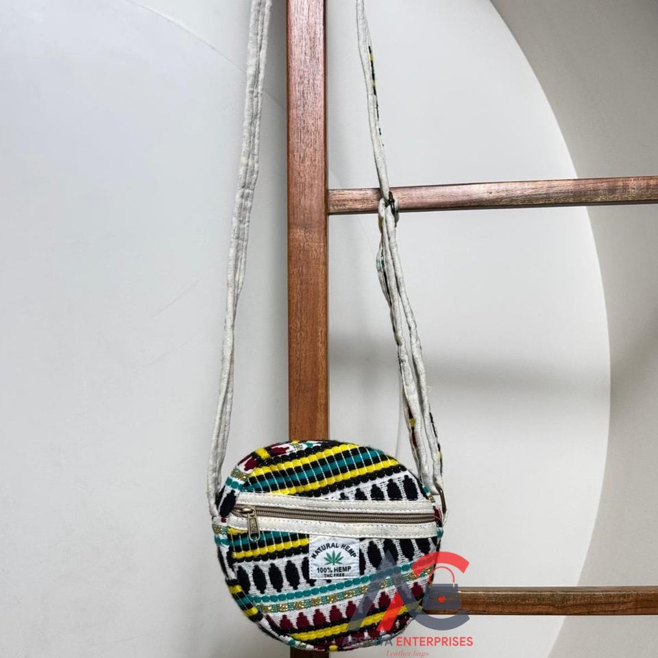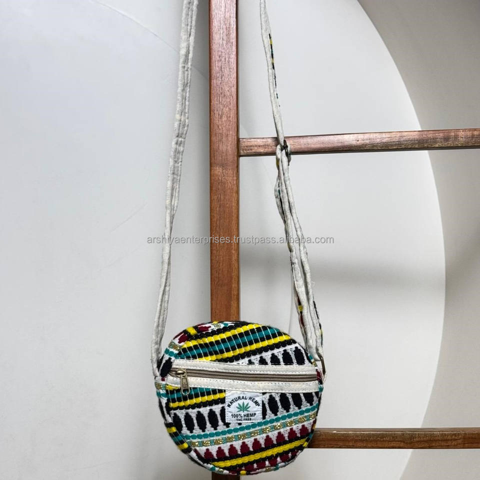 Colorful Round Himalayan Hemp Sling Bag with Tribal Pattern Front Zipper Pocket Eco-Friendly Handmade Small Crossbody Handbags