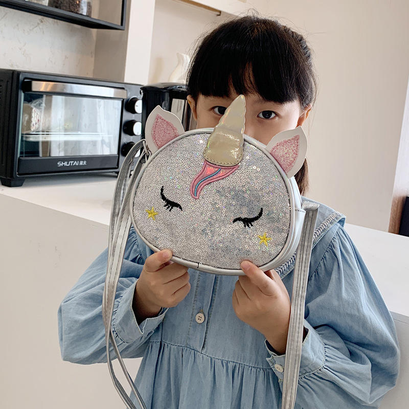 กระเป๋าสะพายข้างเด็กผู้หญิงลายยูนิคอร์นสีสันสดใส น่ารัก สไตล์การ์ตูน แฟชั่นเจ้าหญิง ทำจากหนัง PU ประดับเลื่อม