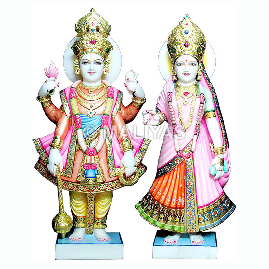 รูปปั้นลักษมีนารายณ์หินอ่อนหลากสีสันแบบตั้งพื้น | รูปปั้นหินอ่อนวิชุนและลักษมี งานฝีมือสำหรับบ้านและวัด – มาลียาส