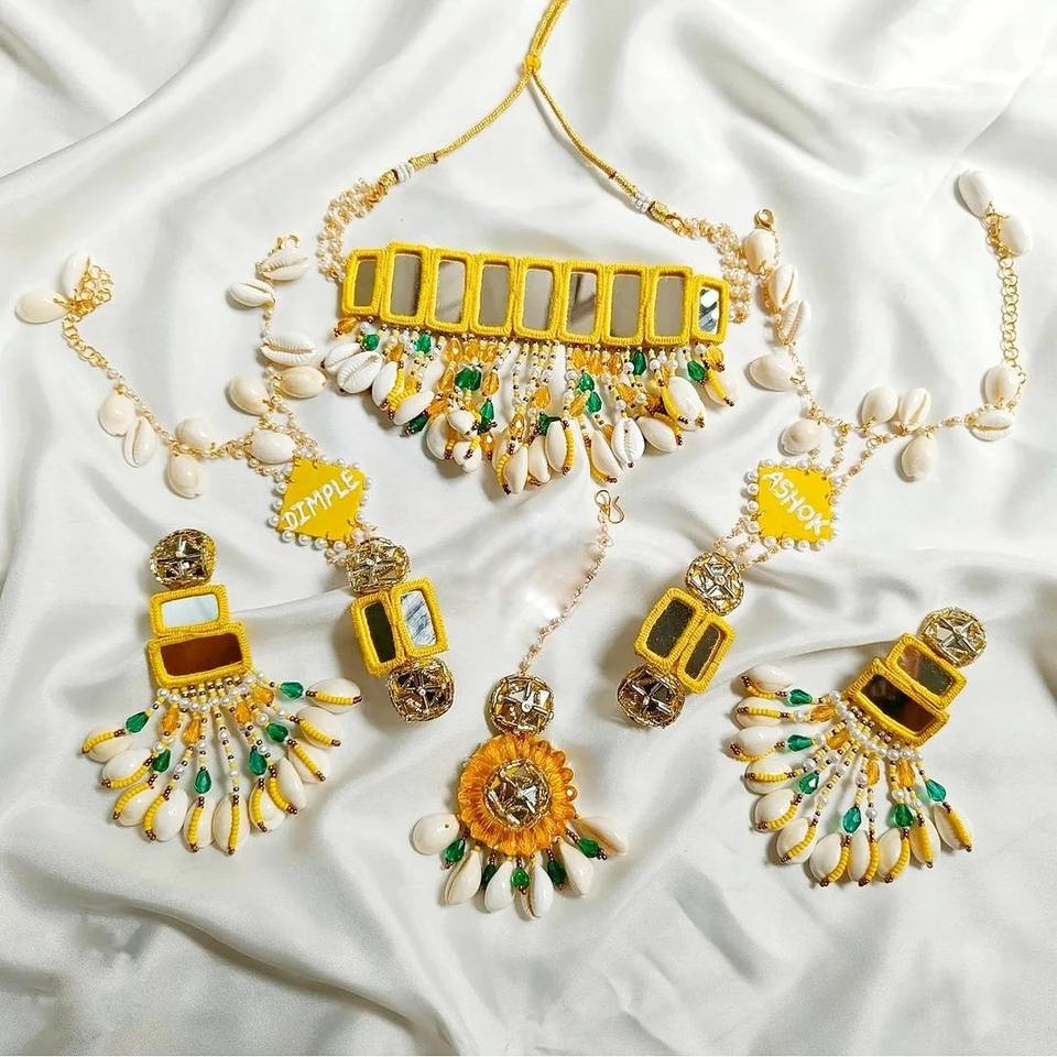 ชุดเครื่องประดับเจ้าสาวงานแต่งงานสีสันสดใสทันสมัย ประดับด้วยเปลือกหอยและลายดอกไม้ ทำด้วยมือ สำหรับงานฮัลดี ประกอบด้วยสร้อยคอ ต่างหู แหวน และกำไลข้อมือ