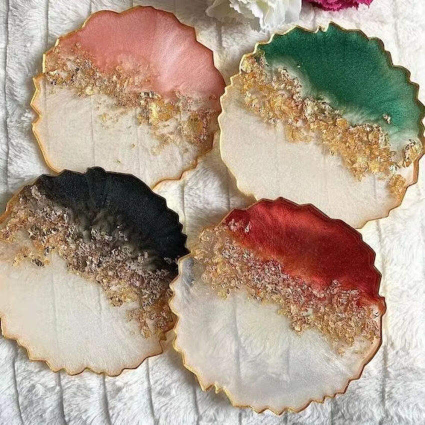 ชุดถาดรองแก้วไม้สีสันสดใสแผ่นปูอีพ็อกซี่ทรงสี่เหลี่ยมทำมือดีไซน์คลื่นแนวนามธรรมสำหรับตกแต่งโต๊ะกาแฟสำนักงาน