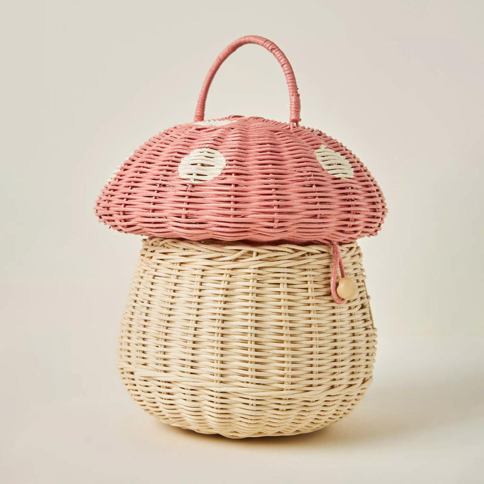 กระเป๋าหวายรูปเห็ดสีชมพูแสนน่ารักสำหรับเด็กผู้หญิง กระเป๋าเด็กทำมือรูปเห็ด