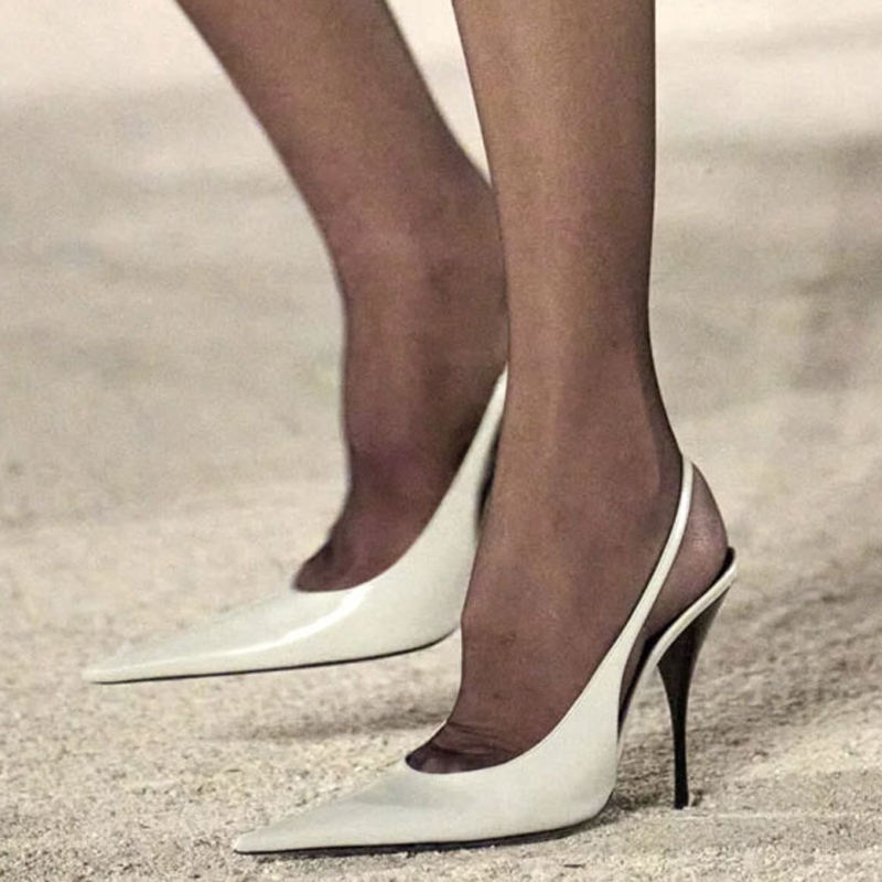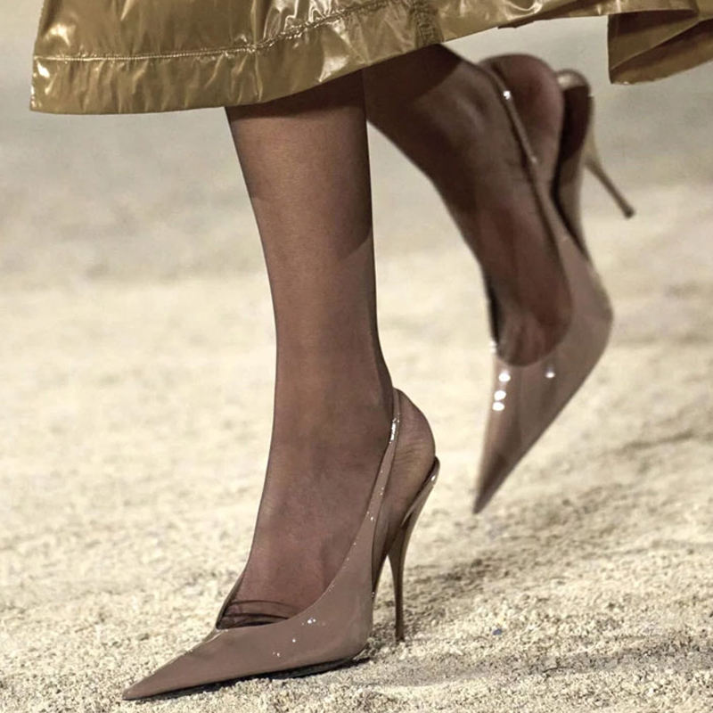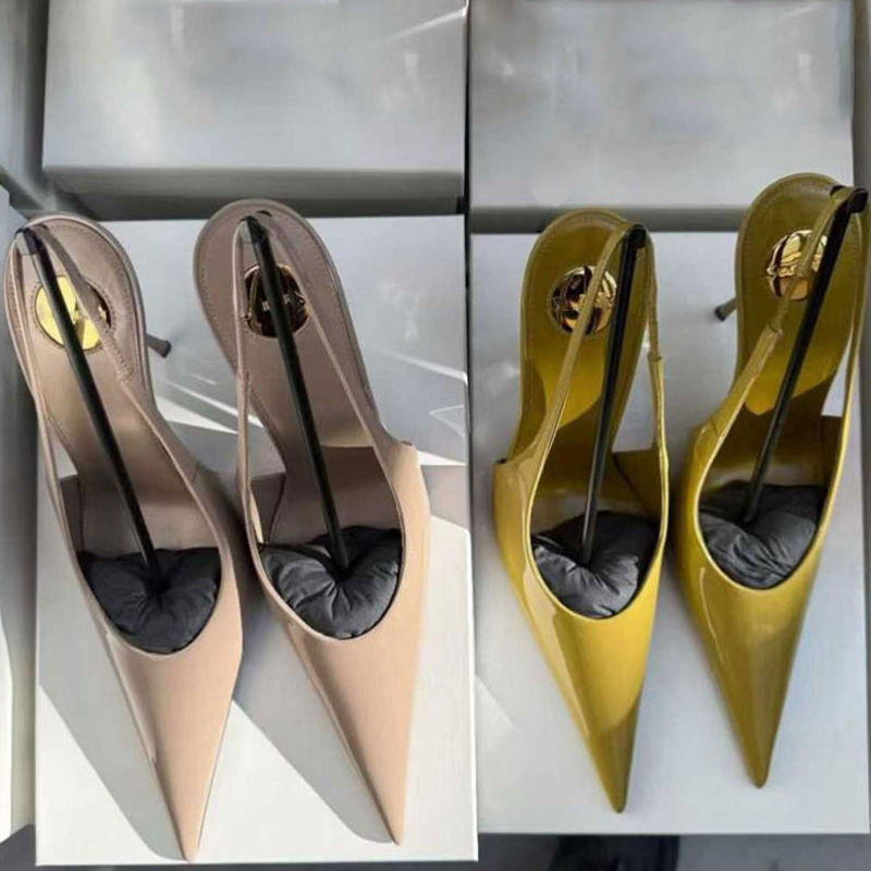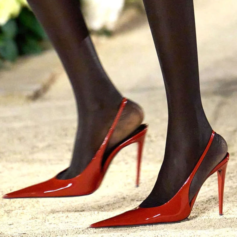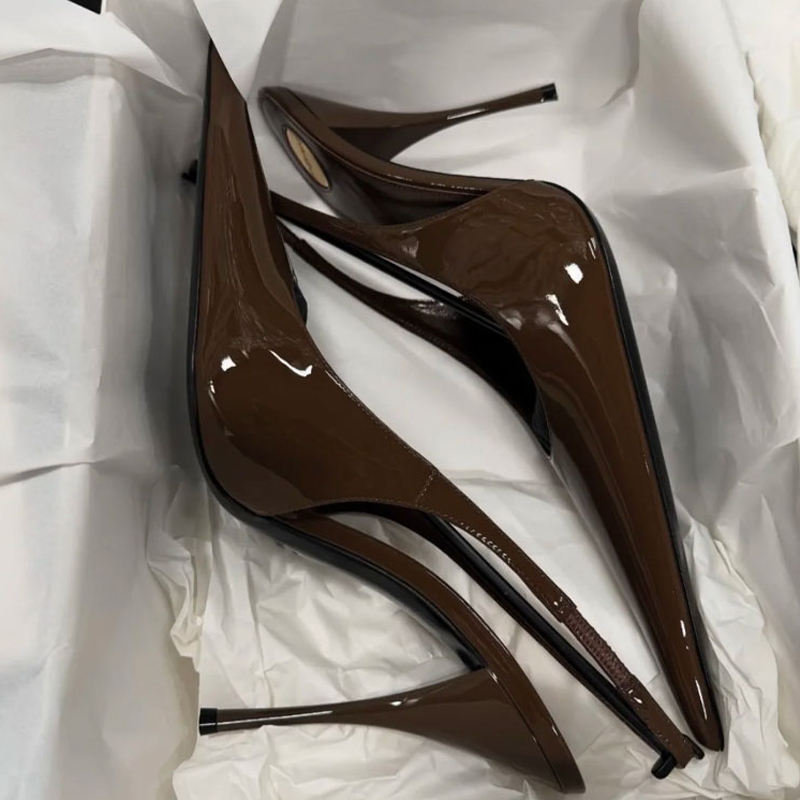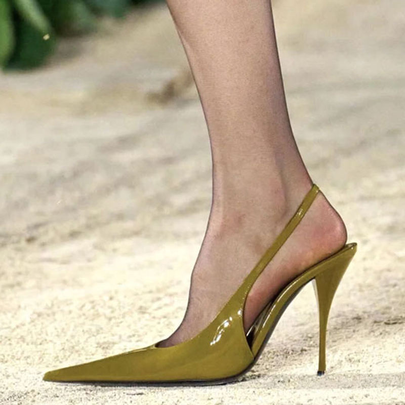 รองเท้าส้นสูงแบบสวมเปิดส้นสำหรับผู้หญิง ดีไซน์หัวแหลม แต่งสายรัดด้านหลัง สีสันหลากหลาย วัสดุหนังแก้ว