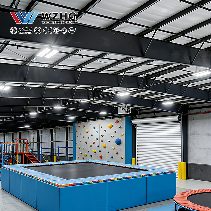 โซลูชั่นสวนสนุกแทรมโพลีนโครงสร้างเหล็กแบบไม่มีเสา ความปลอดภัยสูง ประหยัดพลังงาน โครงการขนาด 8000 ตารางฟุต คุณภาพพรีเมียม รับประกัน 50 ปี