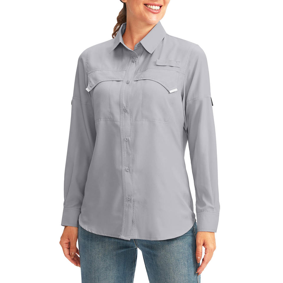 เสื้อตกปลาผู้หญิงไซส์ใหญ่ ทรงสวยใส่สบาย ดีไซน์โดดเด่น ผ้าโพลีเอสเตอร์ 100% ระบายอากาศ แห้งเร็ว ป้องกันรังสียูวี 50+