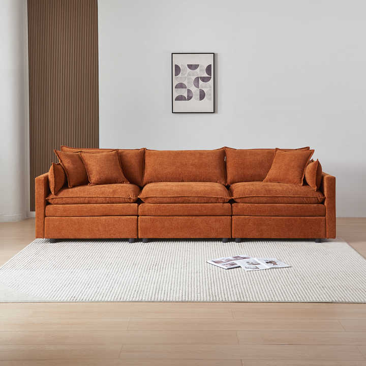 ชุดโซฟาผ้ากำมะหยี่สีส้ม3ที่นั่งที่นั่งโซฟาแบบแบ่งส่วนทรงสี่เหลี่ยมโครงไม้ตกแต่งมุมแบบทันสมัยสำหรับวิลล่า