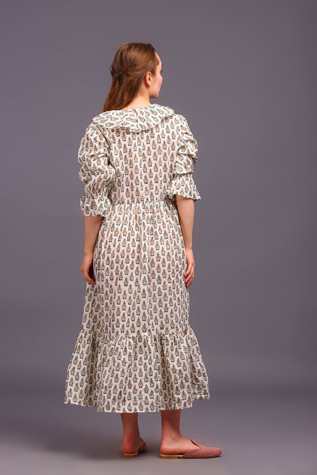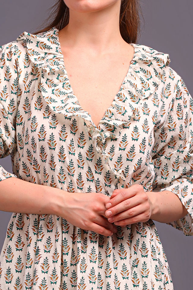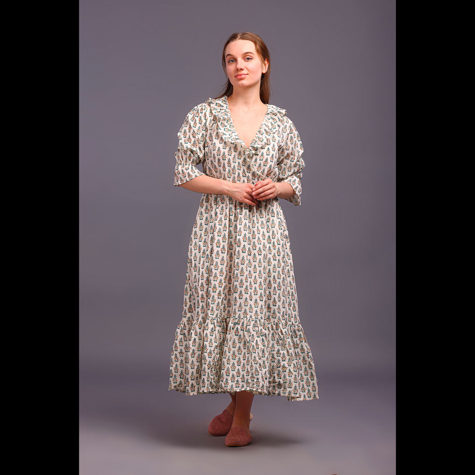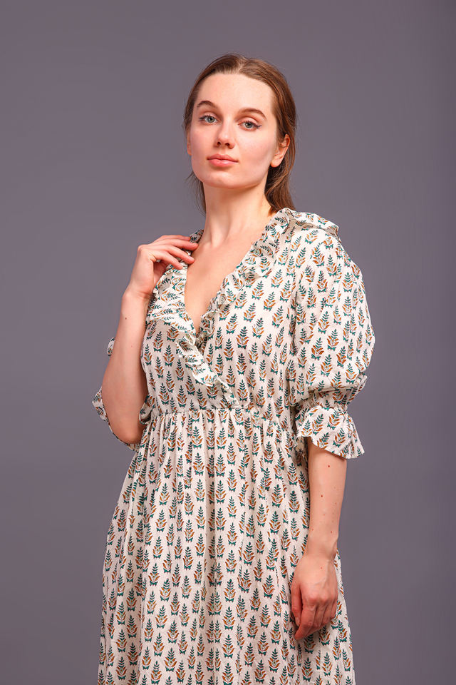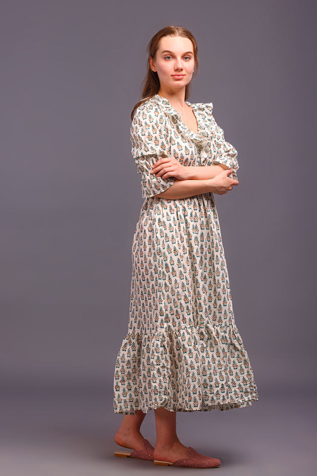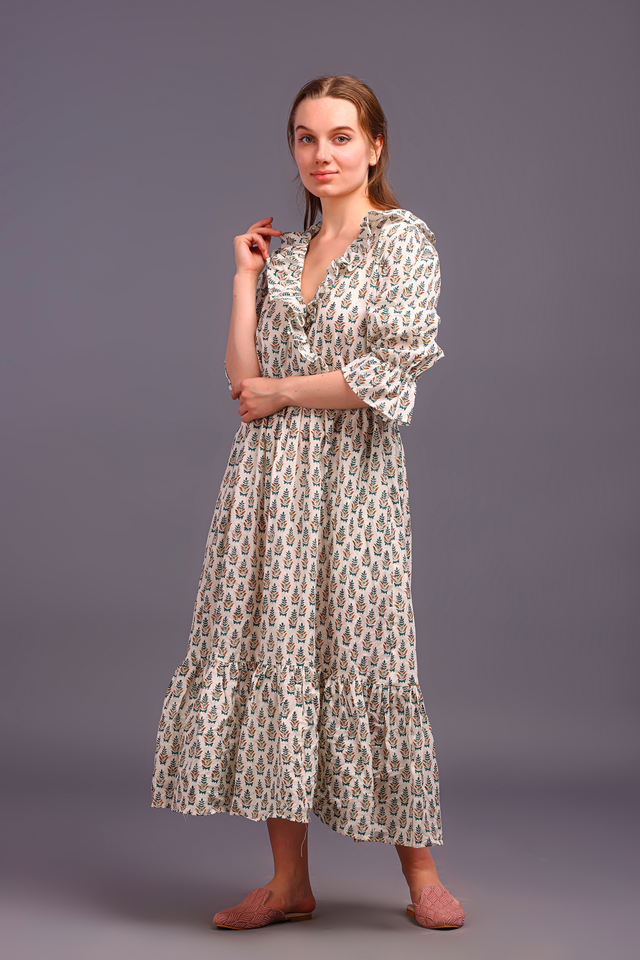 เดรสแม็กซี่ทรงสบาย คอวี ลายพิมพ์บล็อกด้วยมือ ผ้าฝ้าย แต่งระบาย กระเป๋า ซักได้ เป็นมิตรกับสิ่งแวดล้อม เอวธรรมชาติ