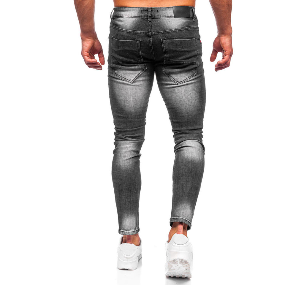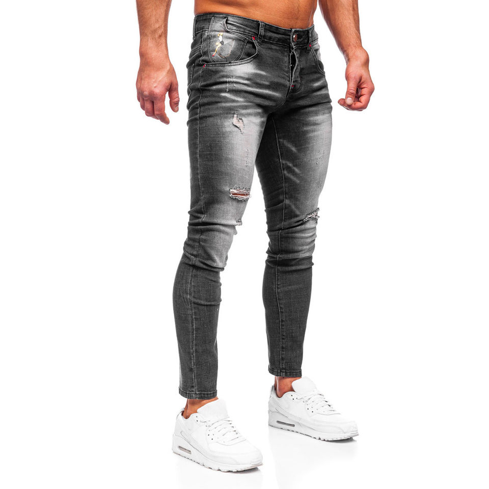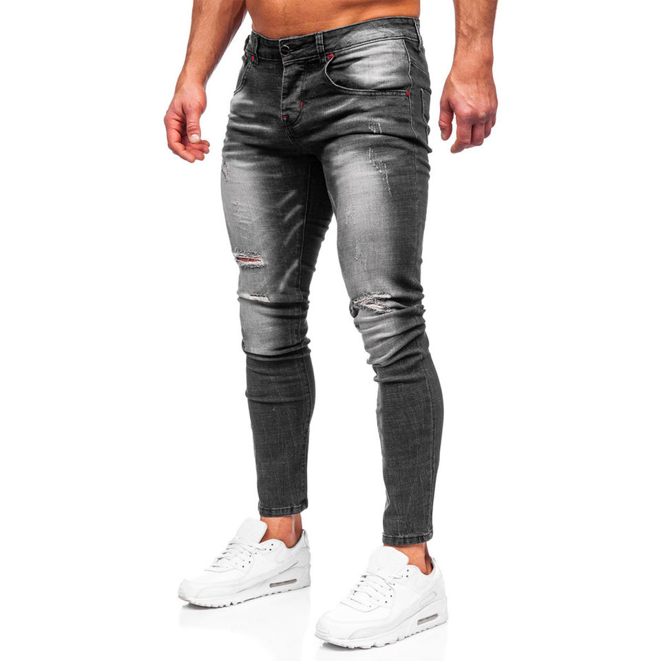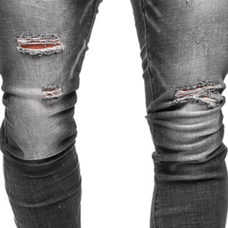 กางเกงยีนส์ผู้ชายทรงสลิมฟิต สีเทา ขาดๆ แบบสบายๆ เนื้อผ้านุ่ม ใส่สบาย ผลิตจากผ้าฝ้ายเดนิม สไตล์สตรีทแฟชั่นทันสมัย