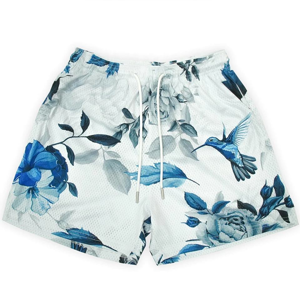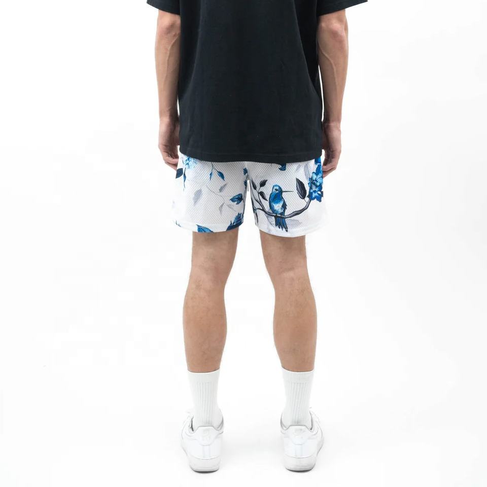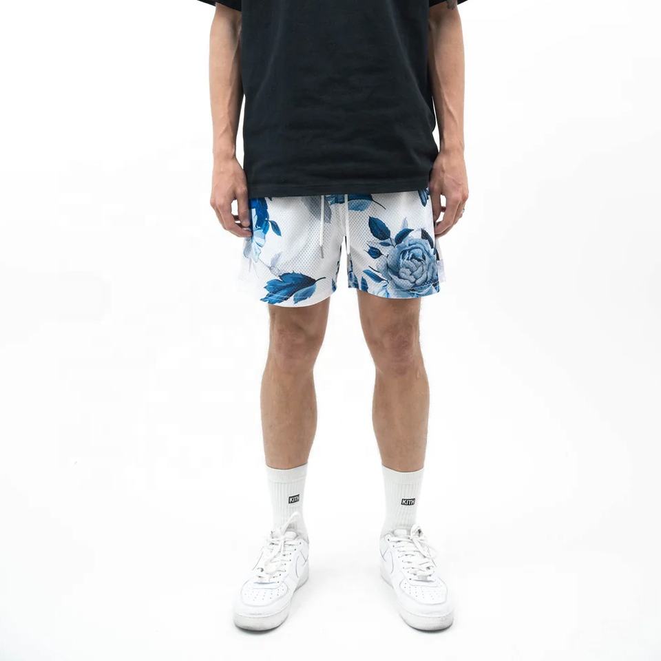 กางเกงขาสั้นเล่นกีฬาสำหรับผู้ชายกางเกงขาสั้นตาข่ายโพลีเอสเตอร์พิมพ์ลายหลากสีดีไซน์บาสเก็ตบอลสไตล์ไฮสตรีท