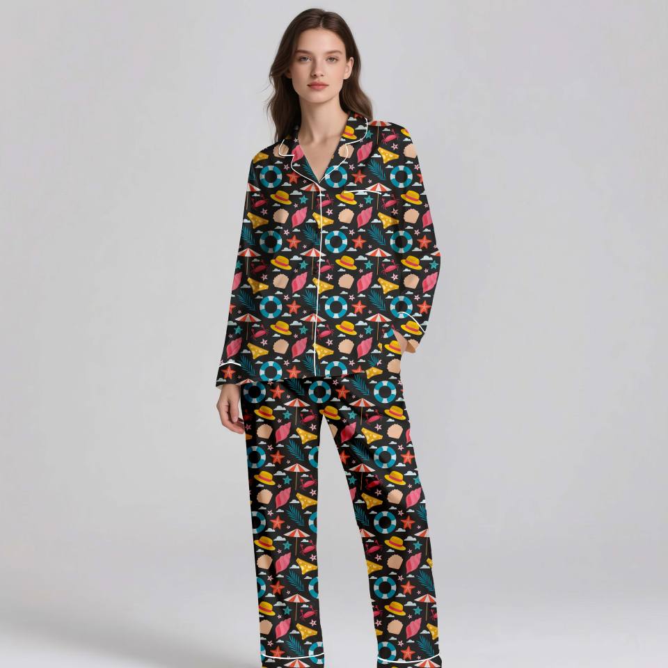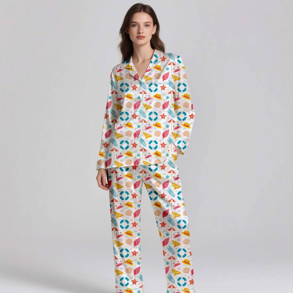 ชุดนอนผ้าซาตินแขนยาว2ชิ้นสำหรับผู้หญิงชุดนอนผ้าซาติน100% แขนยาวชุดใส่อยู่บ้านน่ารักดีไซน์คริสต์มาส