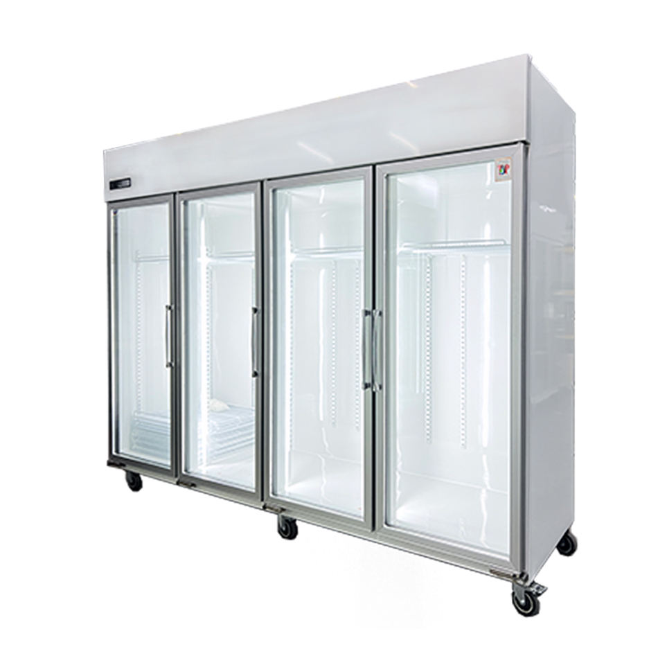 ตู้แช่เย็นแสดงสินค้าแบบ 4 ประตู สำหรับซุปเปอร์มาร์เก็ต ไม่มีระบบทำความร้อน กระจกใส ประหยัดพลังงาน 220-240V อุปกรณ์ทำความเย็นสูงสุด