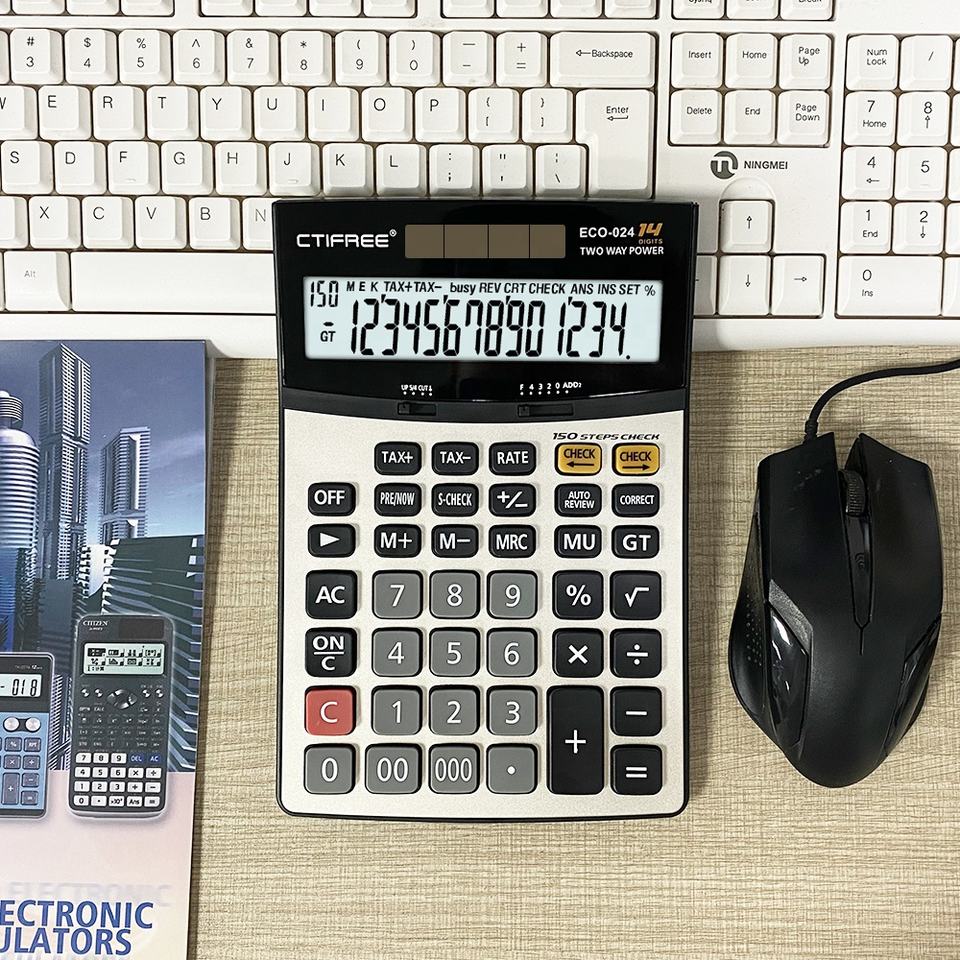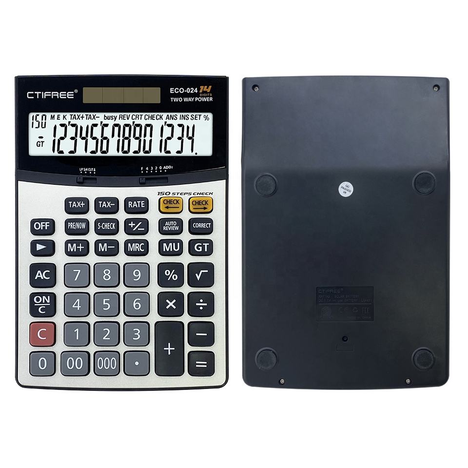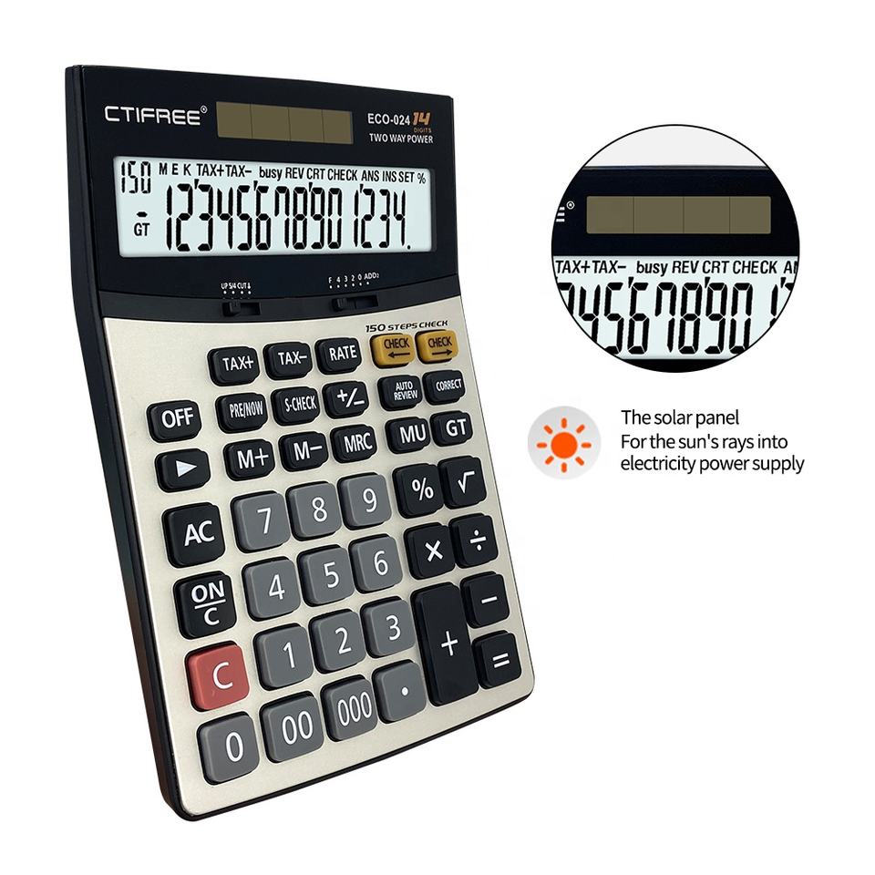 เครื่องคิดเลขตั้งโต๊ะพร้อมขาตั้ง ABS พลาสติกเลขคณิตแสดงแอลซีดีพลังงานแสงอาทิตย์แบบไฮบริดสำหรับใช้ในบ้าน
