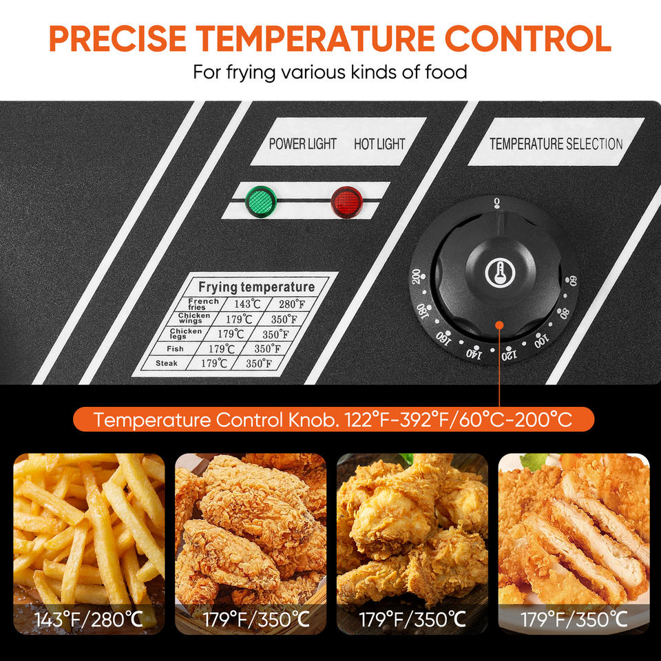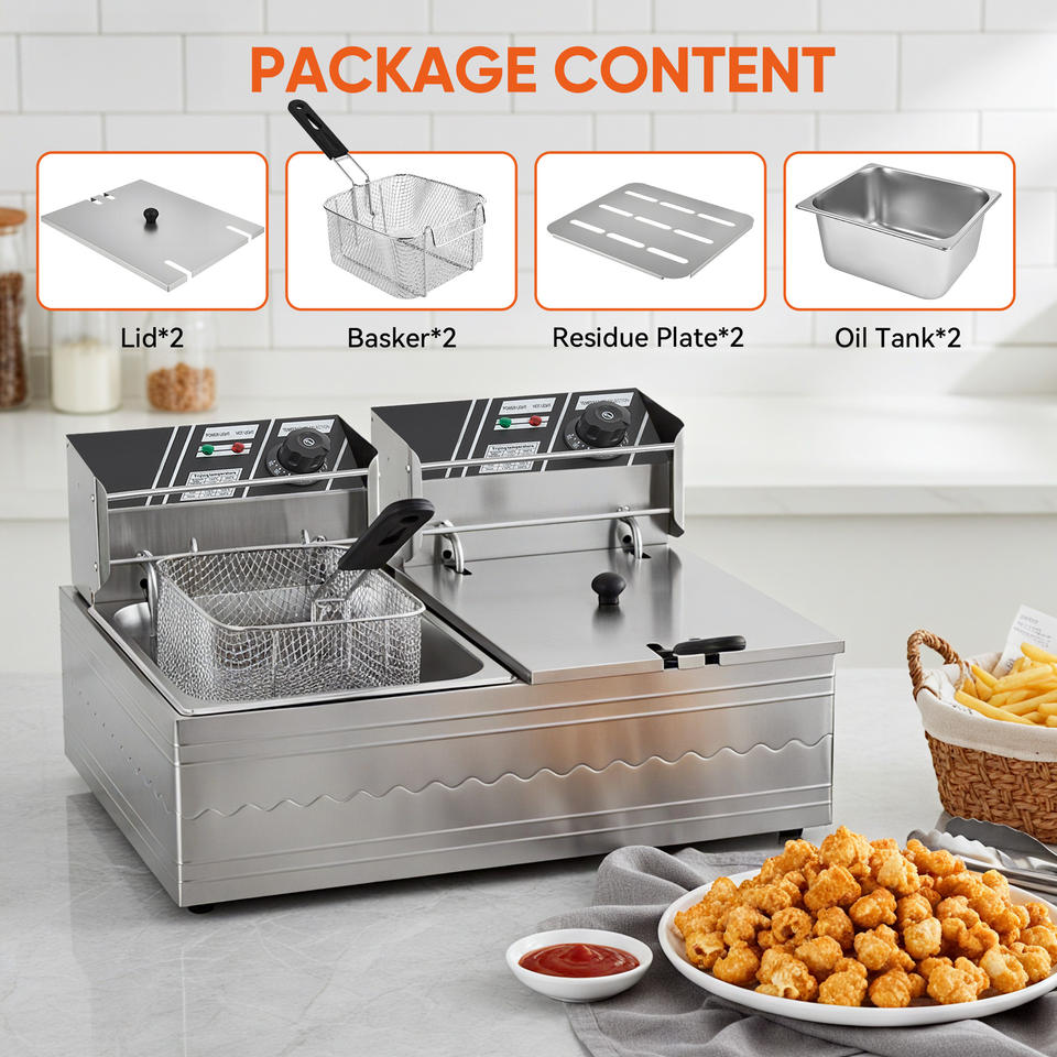 ชุดเครื่องทอดไฟฟ้าแบบสองถังพร้อมตะกร้า 2 ใบ ทำจากสแตนเลส กำลังไฟ 2500 วัตต์ ปลั๊กแบบอังกฤษ ควบคุมอุณหภูมิแม่นยำ ทำความสะอาดง่าย 1