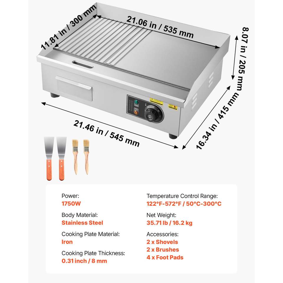 เตาไฟฟ้าเชิงพาณิชย์ ตัวเครื่องสแตนเลส ขนาด 21.06 x 11.81 นิ้ว 1750 วัตต์ 122-570 องศาฟาเรนไฮต์ ปรับอุณหภูมิได้ ครึ่งขนาด