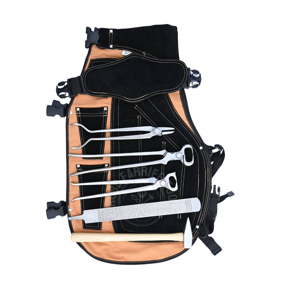 ชุดอุปกรณ์ตัดแต่งกีบม้าสำหรับมืออาชีพ พร้อมเครื่องมือถอดกีบ สีน้ำตาล ผ้ากันเปื้อน คีมตัดกีบ คีมหนีบกีบ คีมตัดกีบขนาด 15 นิ้ว ค้อน และตะไบ