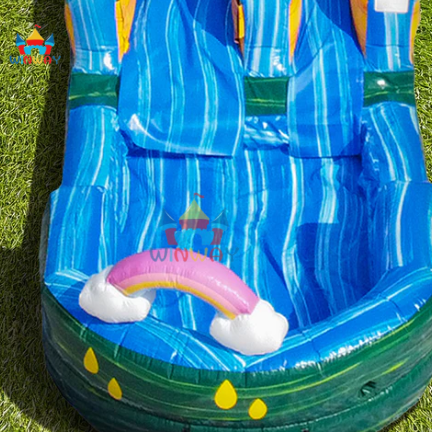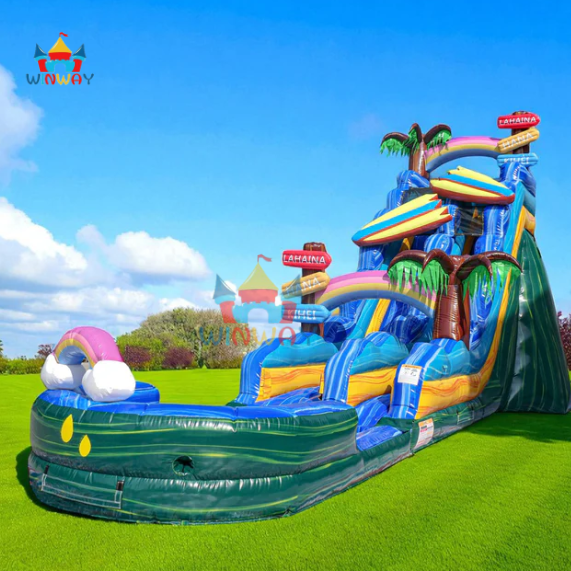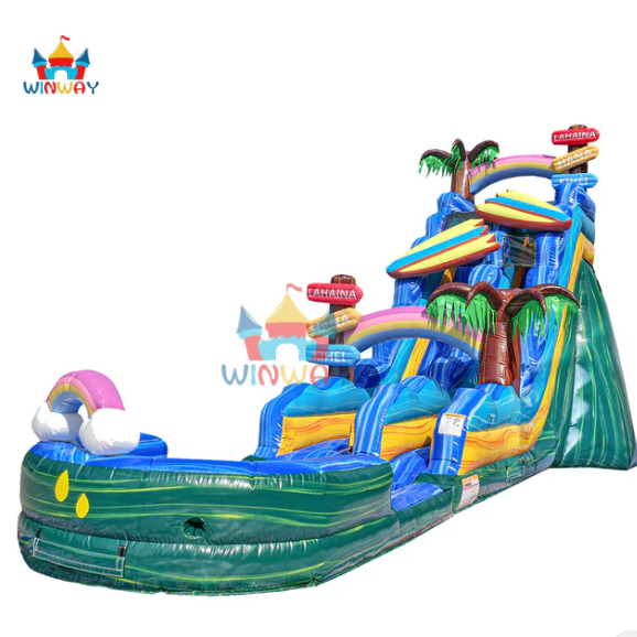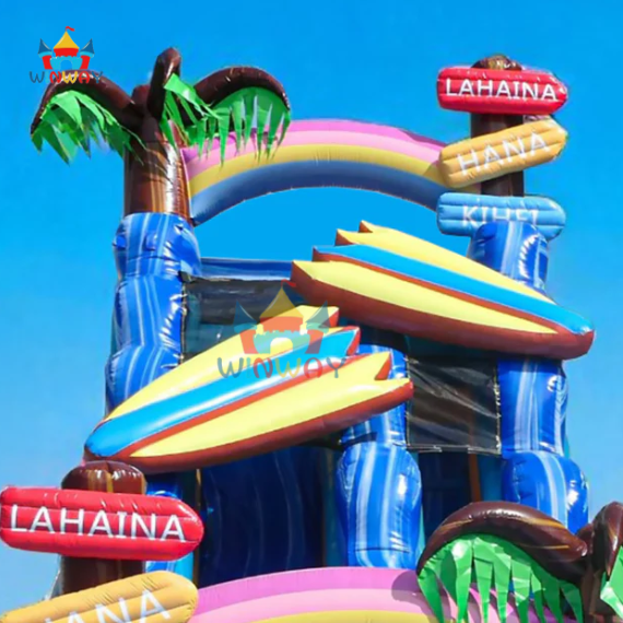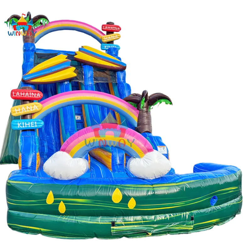 สไลเดอร์เป่าลมพิมพ์ลายฮาวายเกรดเชิงพาณิชย์ทำจากพีวีซีสีสันสดใสดีไซน์สีรุ้งและต้นปาล์ม